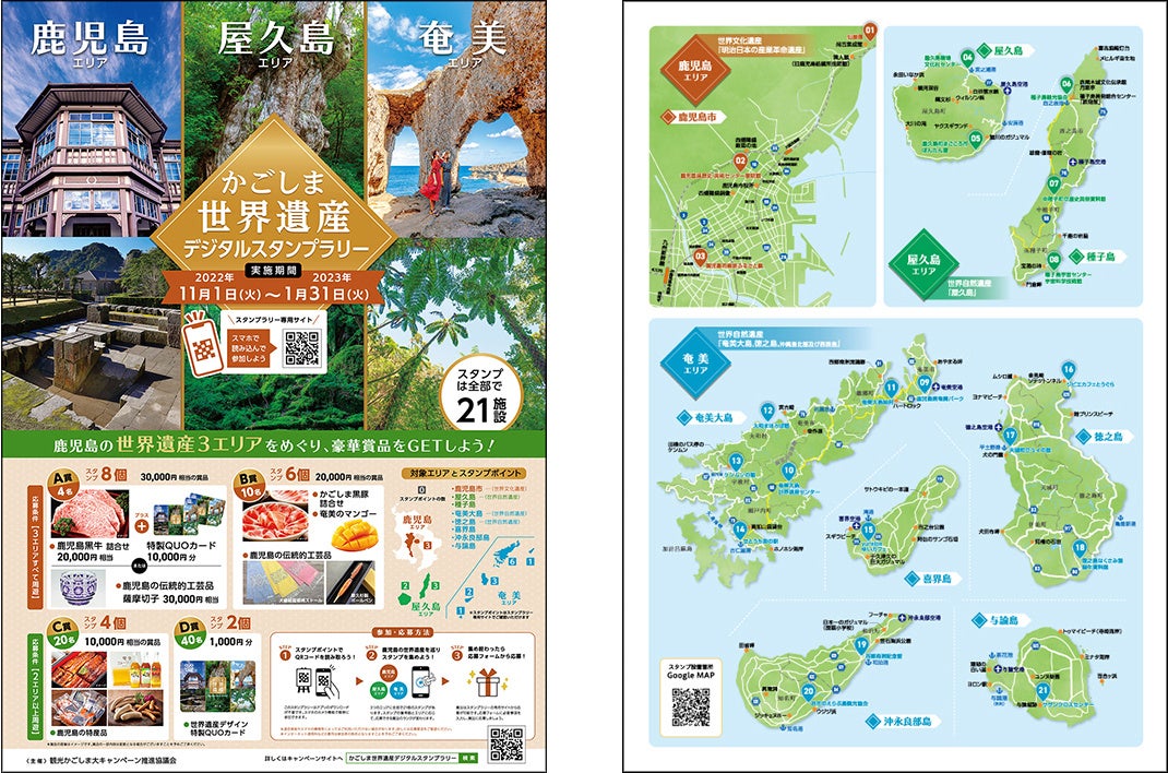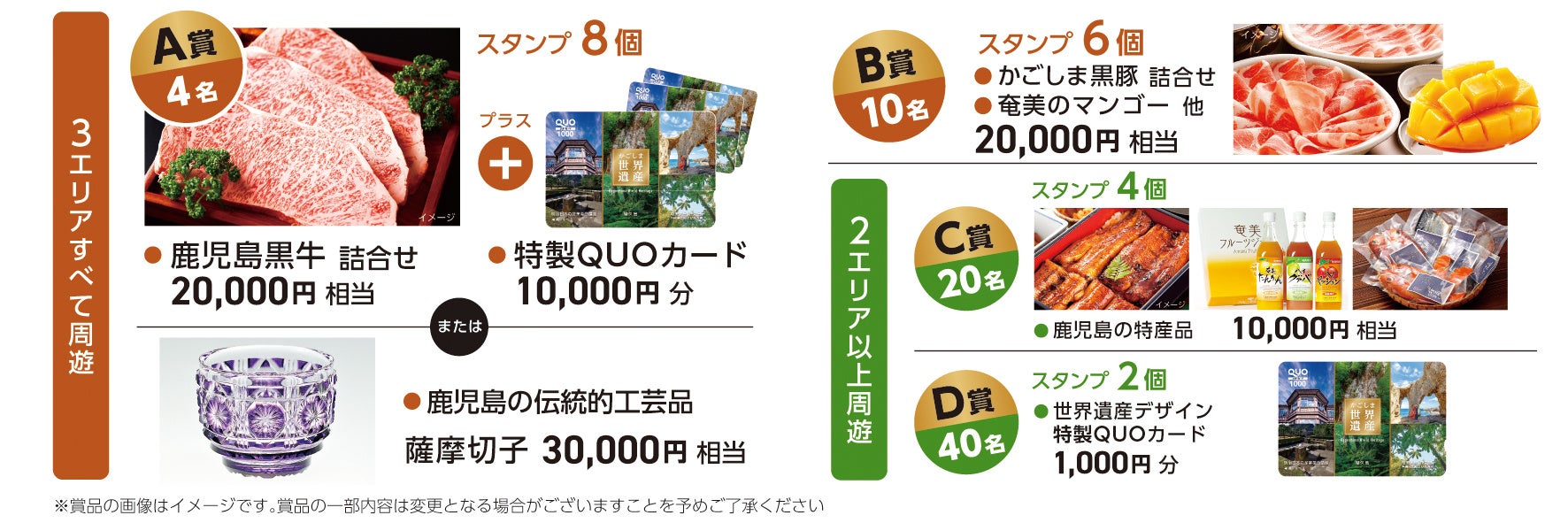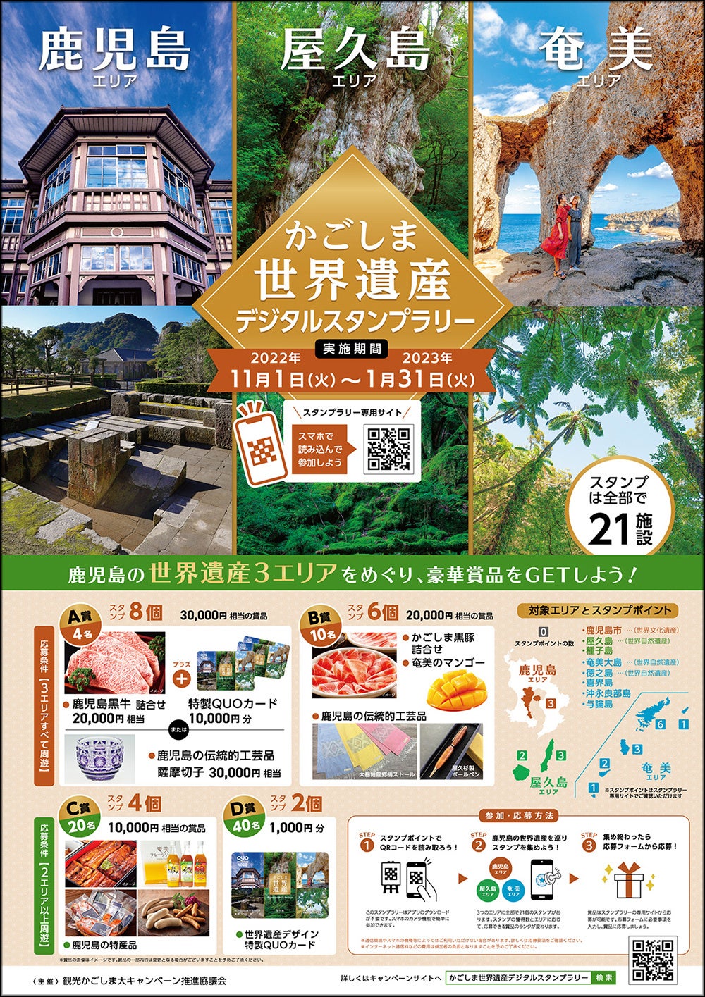 昨年7月に、「奄美大島,徳之島,沖縄島北部及び西表島」が世界自然遺産へ登録されたことを記念して、鹿児島県内の3つの世界遺産のPR及び周遊促進を目的に企画しました。世界文化遺産「明治日本の産業革命遺産」の構成資産がある鹿児島エリア、世界自然遺産「屋久島」と種子島を含む屋久島エリア、世界自然遺産「奄美大島・徳之島」を含む奄美群島の奄美エリアのうち、2エリア以上周遊し、各エリアのスタンプ(3エリア全21ヶ所に設置)を集めると、鹿児島黒牛やかごしま黒豚などの「鹿児島の特産品」や「世界遺産オリジナルデザインの特製QUOカード」等の豪華賞品が当たるキャンペーンに参加できます。スタンプの取得個数に応じて応募できる賞品のランクが上がるため、より多くの観光地を巡っていただく機会となることを期待しています。