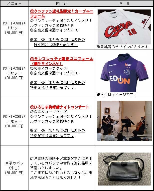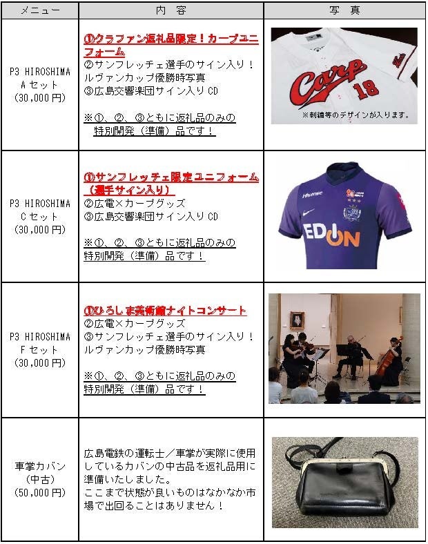 その他、「サンフレッチェ選手サイン入り試合球」、「トランルージュでのコンサート」、「広響・サンフレ・カープ電車、3車両並べての撮影会」や「5100形の吊り輪」など、グッズやイベントなど、多方面に渡る返礼品を30種類程度ご準備しております。(最小金額 1口3,000円~最高金額 1口100,000円を予定)