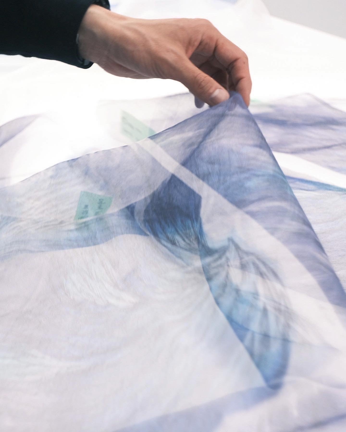 コレクションの衣服制作では、デジタル捺染技術を活用することで、水資源保全、適量生産、クリーンな生産工程を実現しています。また、捺染の後工程で行われる「蒸し」や「洗い」といった工程を必要としない顔料インクを採用しており、これによって水の使用量を削減することと、YUIMA NAKAZATOが目指す繊細で表情豊かなプリントの再現性との両立が可能になりました。デジタル捺染の特徴を活かし、環境性と表現性の両立させた新しい衣服作りを発信してまいります。