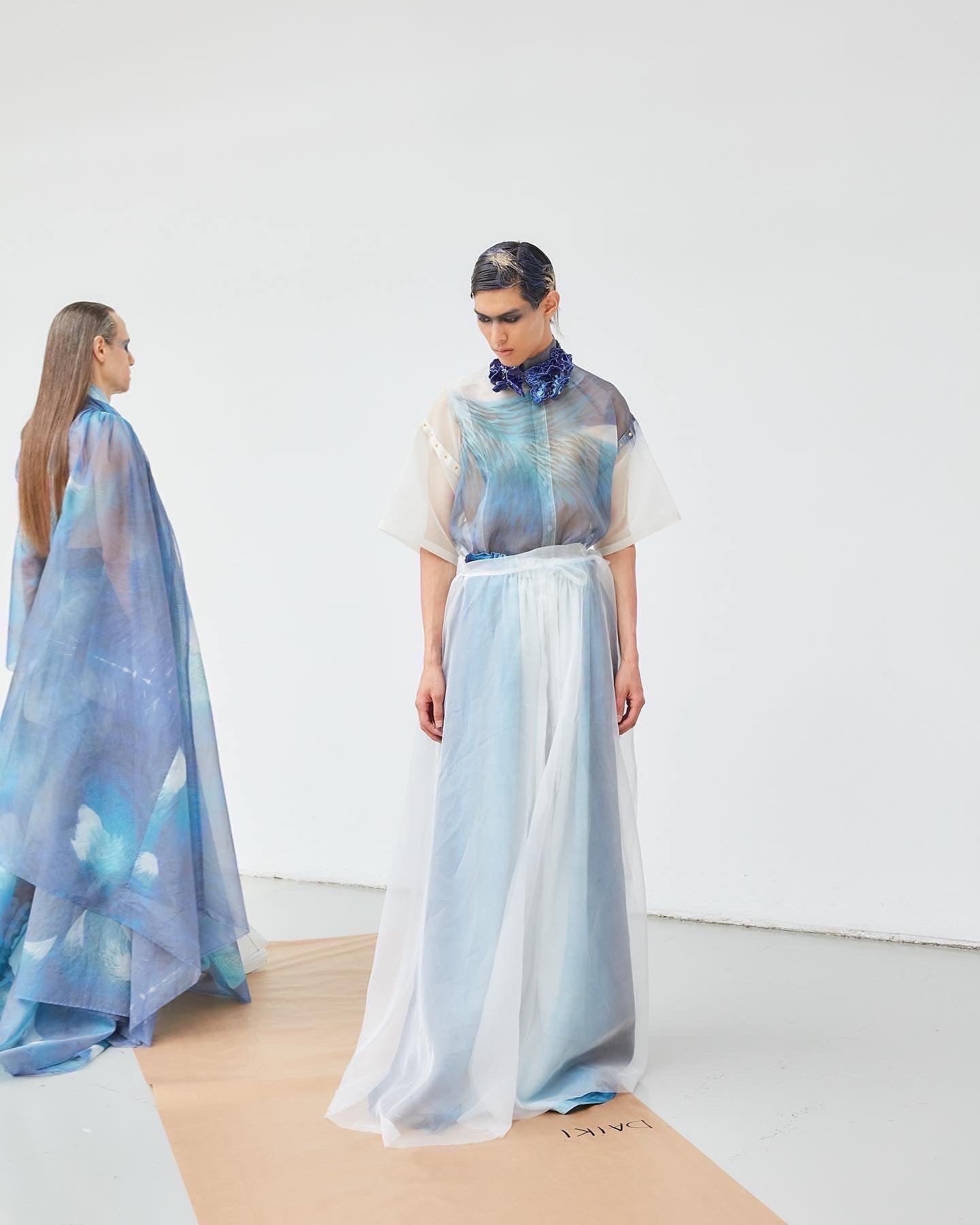 エプソンには2021年より、オートクチュールウィークで発表しているYUIMA NAKAZATOのコレクションにて衣装表現をサポートいただいております。エプソンのソリューションセンター富士見を活用し、シルクオーガンジーなど印刷難易度の高い極薄の生地へも印刷が可能になったことで、素材の選択肢も格段に広がり、また、中里がデッサンした繊細なタッチや濃淡をプリントで再現いただき、デザインサイズの制約も取り除いていただいたことで、クオリティをより追求した作品の発表へと繋げていただきました。今後も、エプソンのインクジェット技術を用いることで、新しい衣服の可能性を開拓し、表現性をより深め、広げていくための取り組みを進めます。