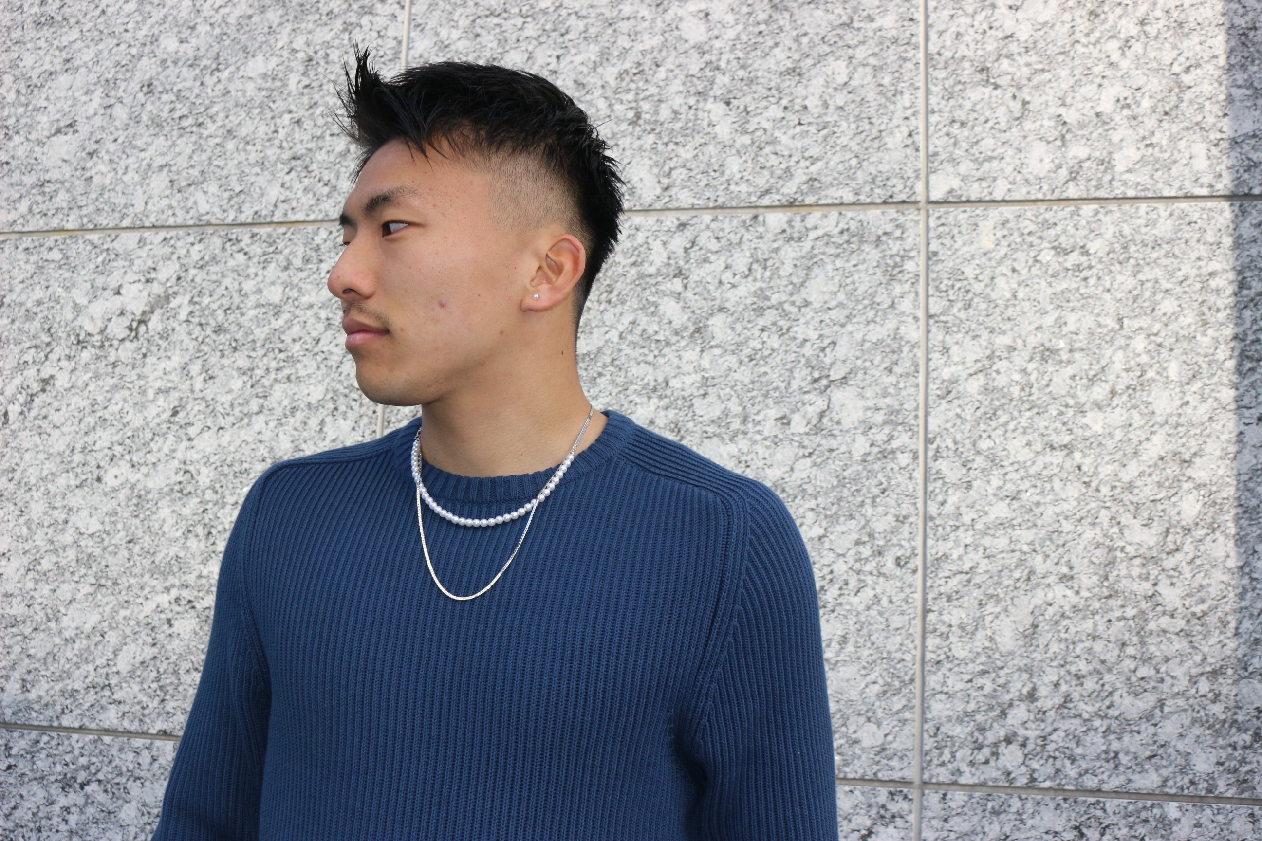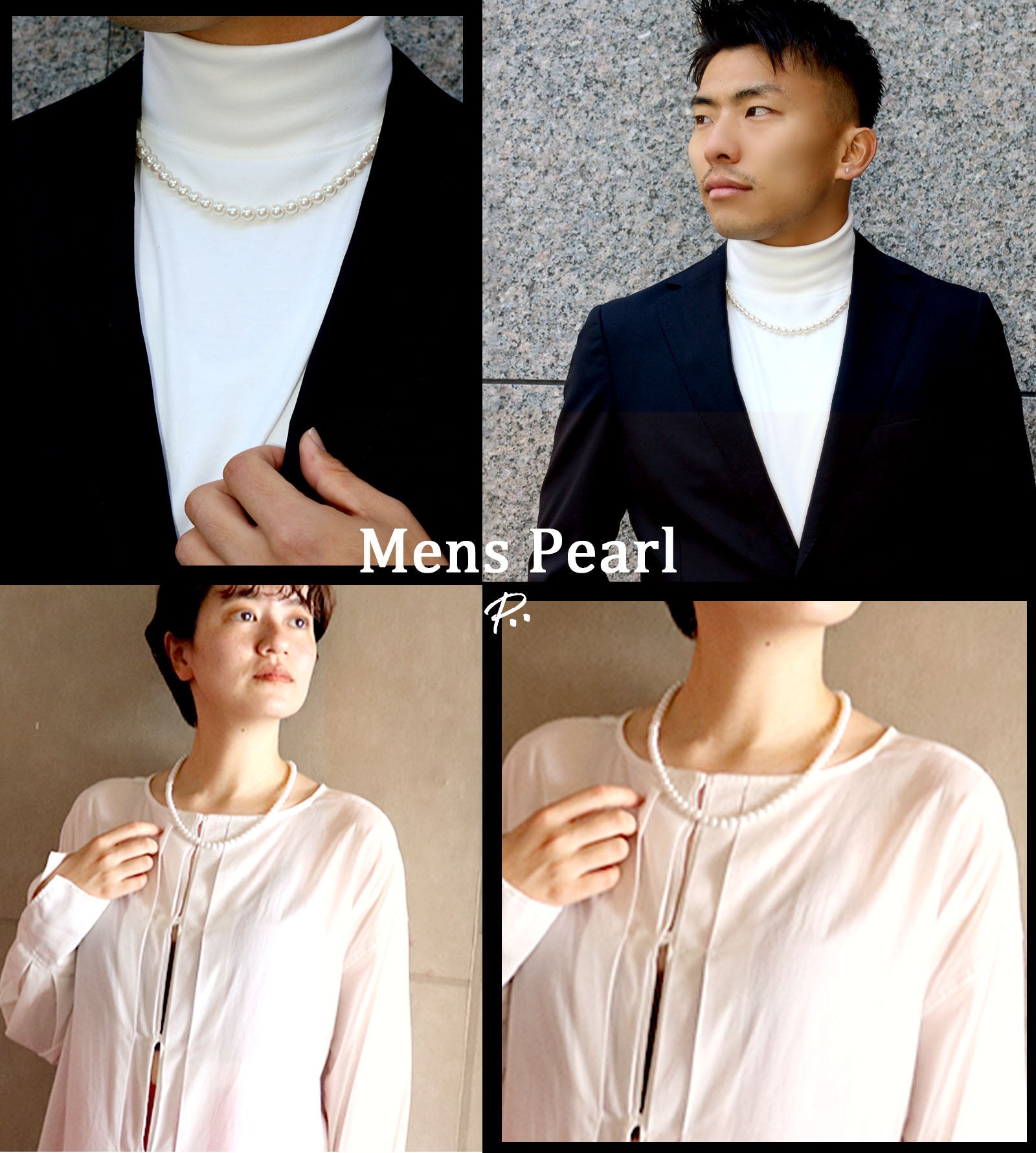 昨今ではメンズパールが流行しつつあります。ネットで検索をかけて調べても一目瞭然でわかるほどの認知度に。初めは海外アーティスト・モデル・セレブの着用から発信され、更にファッション界のジェンダーレス化でパールが注目されるようになってきました。日本でも2022年頃~芸能人・モデルを中心に広がり、ファッション誌の表紙などでも見かけるようになりました。日本ではまだまだですが、世界のメンズパールの普及で日本でも「もっと男性にも沢山のアクセサリーを身に着けてほしい」、「もっと沢山の人に手軽に買ってもらえるパールブランドを作りたい」と思い、開発されたのが今回の「P:(ピーコロン)パールネックレス」です。