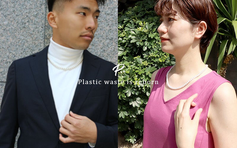 プラスチック廃材から作られたパール素材が普通のパールのような美しさに。お手入れも簡単で変色が少ない。