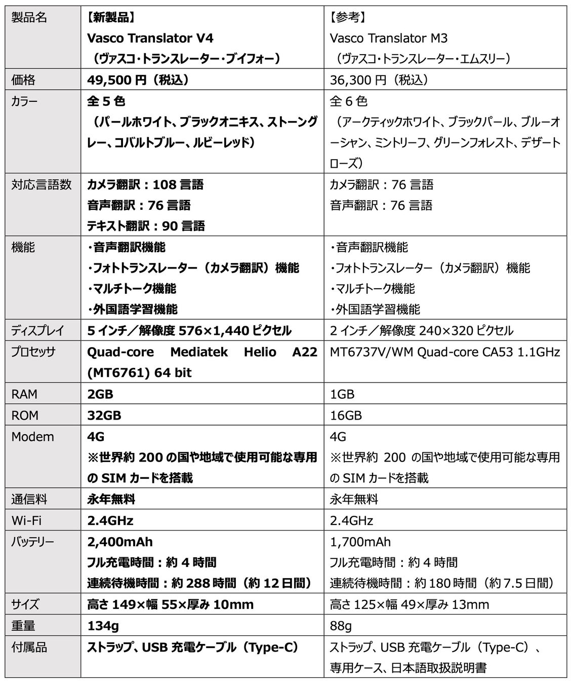 「V4」は、2021年に「Makuake」で889名から2,500万円を超える応援購入をいただくといった反響を受け一般発売した「Vasco Translator M3」(以下、「M3」)に次ぐ新機種で、約1.5倍の108言語への対応といったソフト面や、5インチのフルスクリーンなどのハード面でも大幅に進化しました。