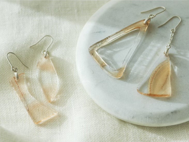 天井装飾のパーツとアクリルの端材を組み合わせることで、モダンな印象のアクセサリーが誕生しました。
