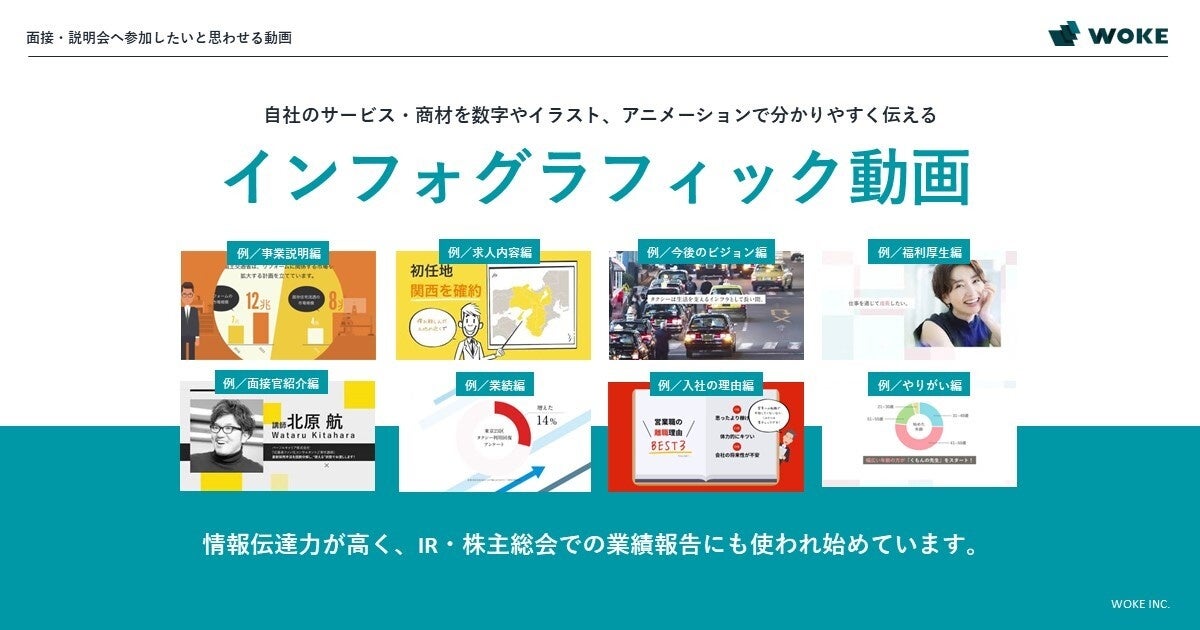 「あしたを、あたらしく、あなたらしく」をテーマに、採用・転職支援を手掛けるWOKE株式会社(本社:東京都港区、代表取締役:小原 崇幹)は、2022年11月1日(火)より「インフォグラフィック採用動画」サービスをリリースいたします。