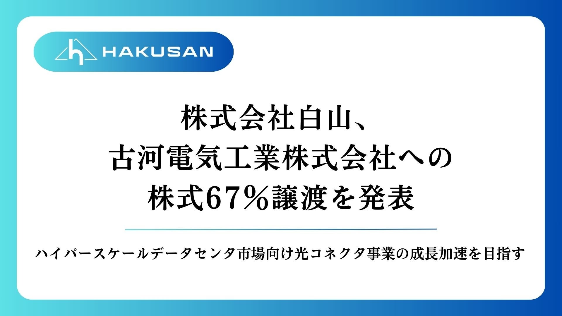 現在当社の筆頭株主であるDPIP1号および当社の代表取締役である米川達也は、古河電工と株式譲渡契約を締結し、2025年1月30日付で、白山の株式計67%を古河電工に売却します。これにより当社は、MTフェルールを含む光コネクタ開発力とコスト競争力、古河電工の総合的な技術力とのシナジーを発揮し、製造能力と製品開発スピードにおける市場での優位性を確立すると同時に、経営基盤のさらなる安定性を有する成長企業へと変貌致します。