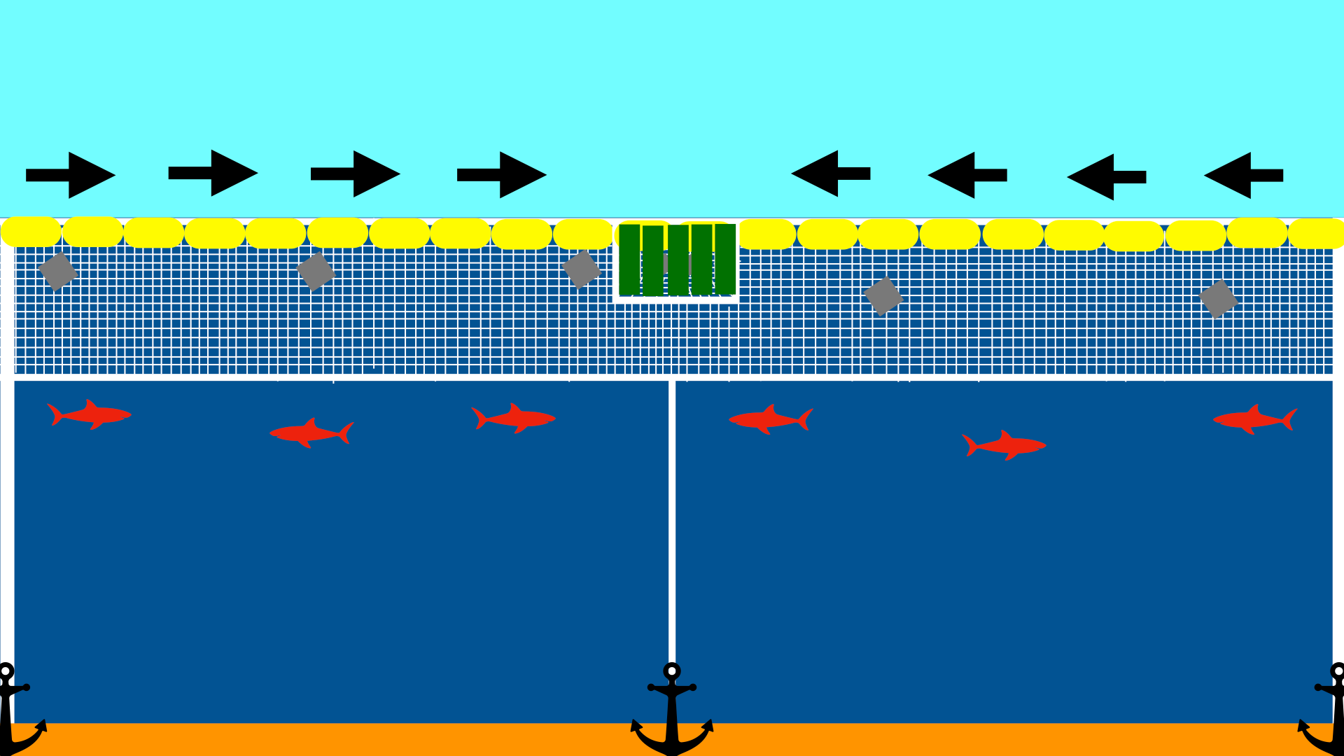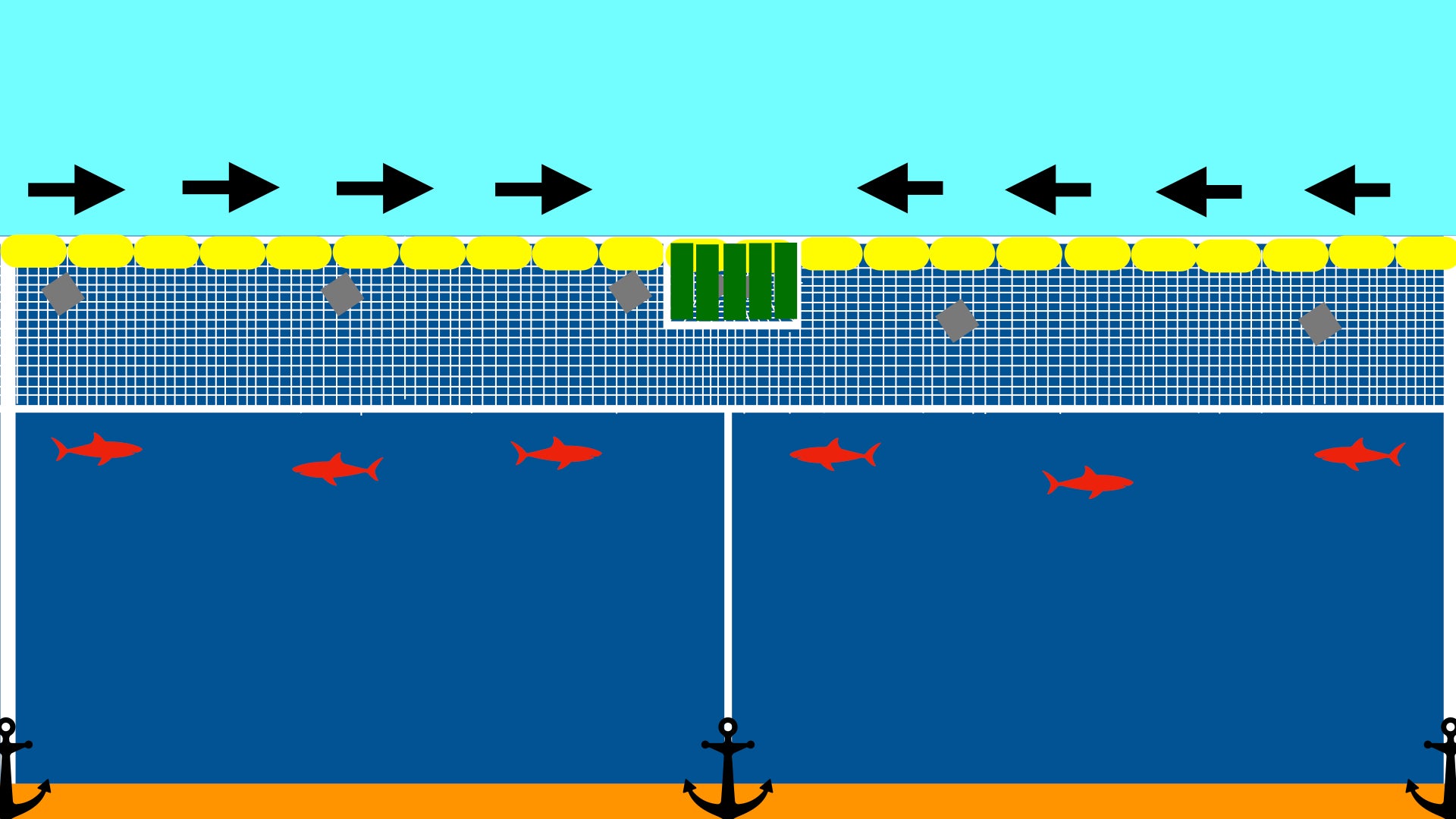 断面図。水面のみを網でカバーすることで浮いてくるプラごみを回収し、魚は逃げられる仕組みにする。