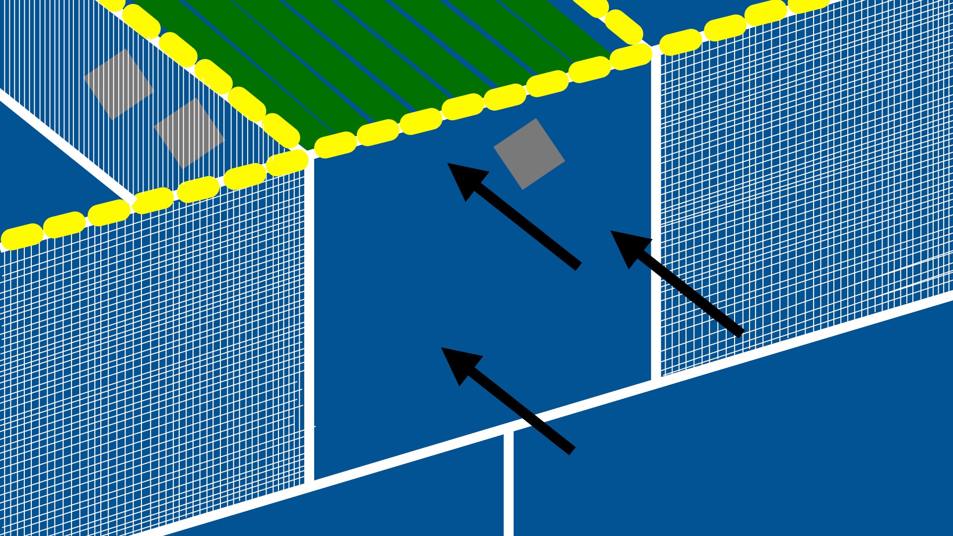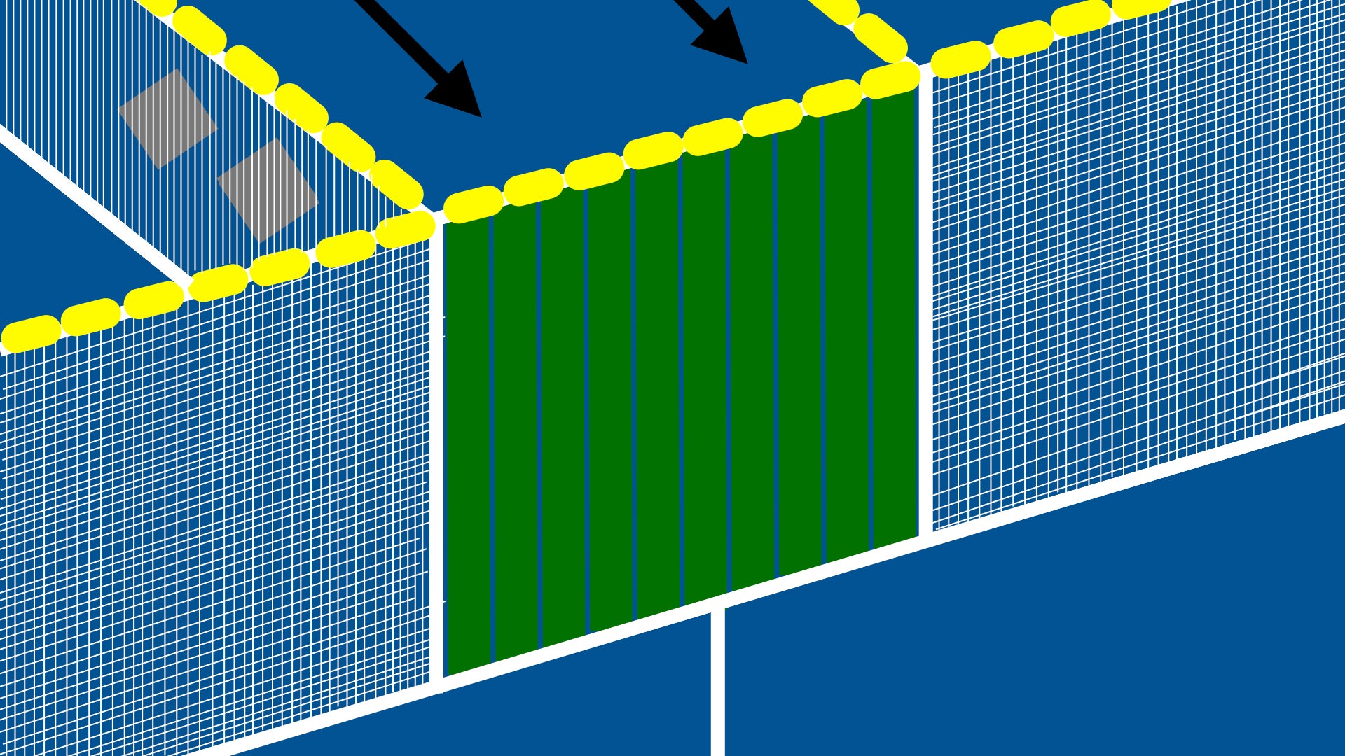 平面図。二号機ではIの字設置だったため、真ん中の回収ポケットに海洋ごみが入らなかった。Uの字設置に変えることで真ん中のポケットへ海洋ごみを誘導する。