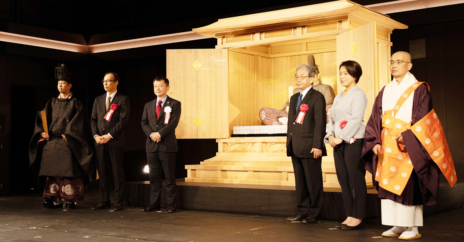 江里仏師が約9か月かけて向き合った源頼朝公像の姿は、独自の頼朝をイメージ。 京都・神護寺の伝源頼朝像、山梨県・甲斐善光寺の頼朝像に加え、東京国立博物館の伝源頼朝坐像の三体を独自に調査・研究し、頼朝の中にある「神性」を見出して現代に甦る源頼朝公像が生み出されました。「坂東武者にもまれながら、数々の苦難を経て大願を果たした頼朝の人生を通して、現代の人にも勇気を感じてもらえたら」と話しました。