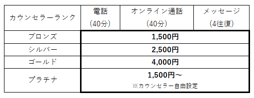 料金はカウンセラーのランクにより異なります(料金表参照)。