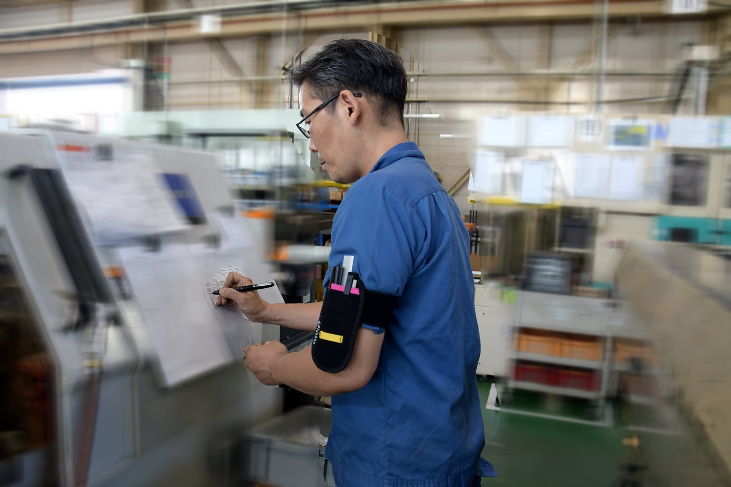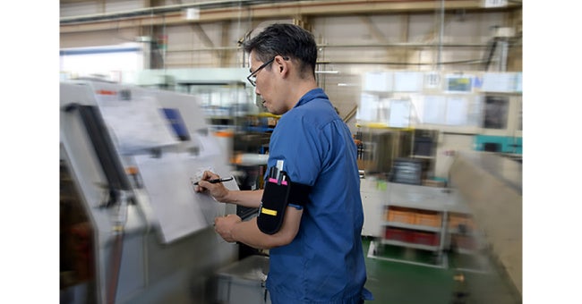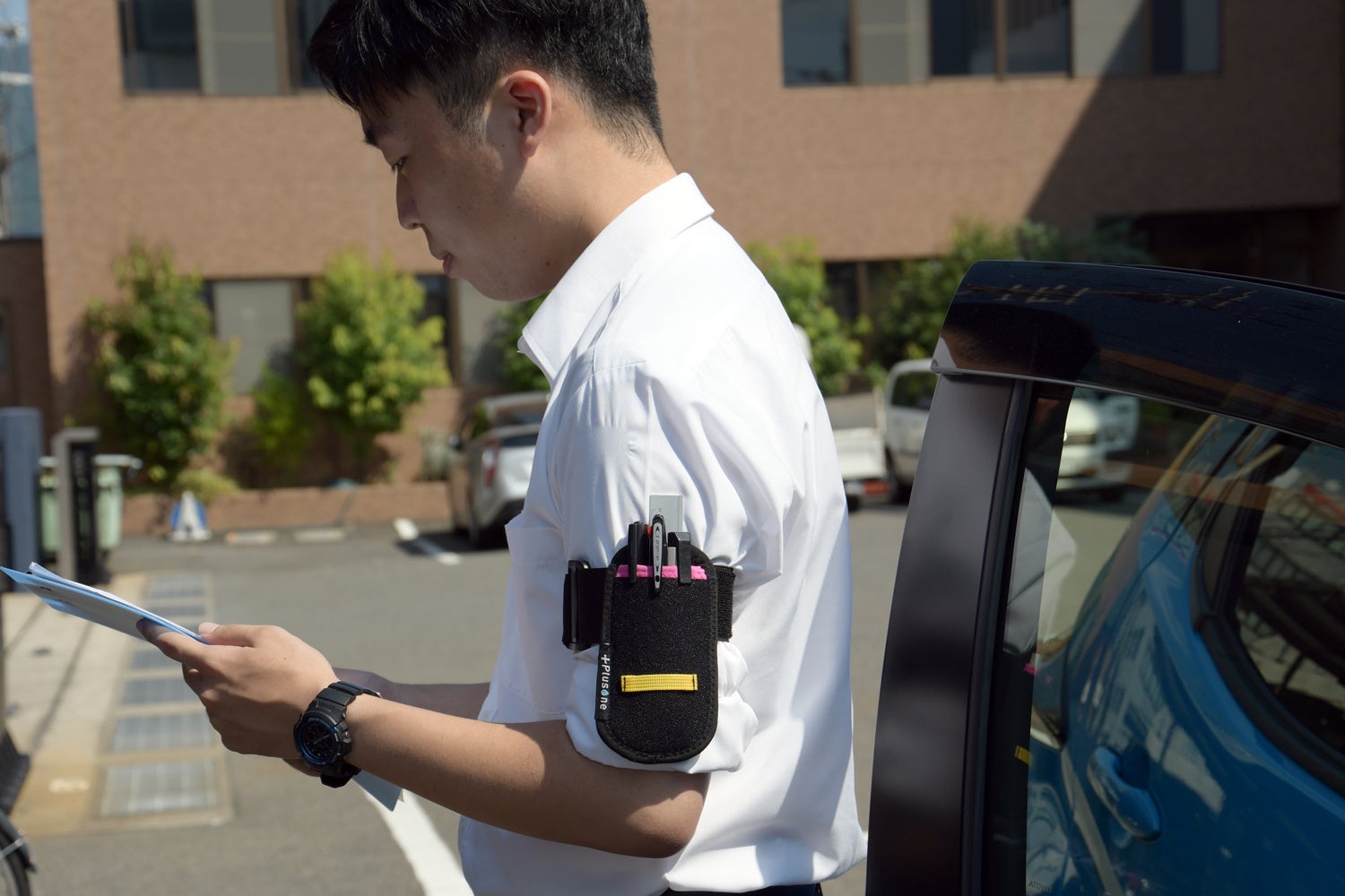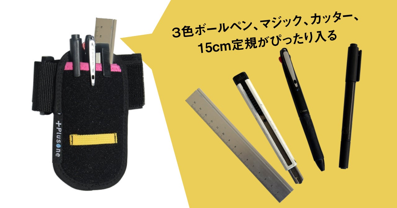 腕に必要以上の重さの物を付けると作業性が落ちるため、現場で最低限必要なボールペン・マジック・カッターだけが入るサイズ設計です。