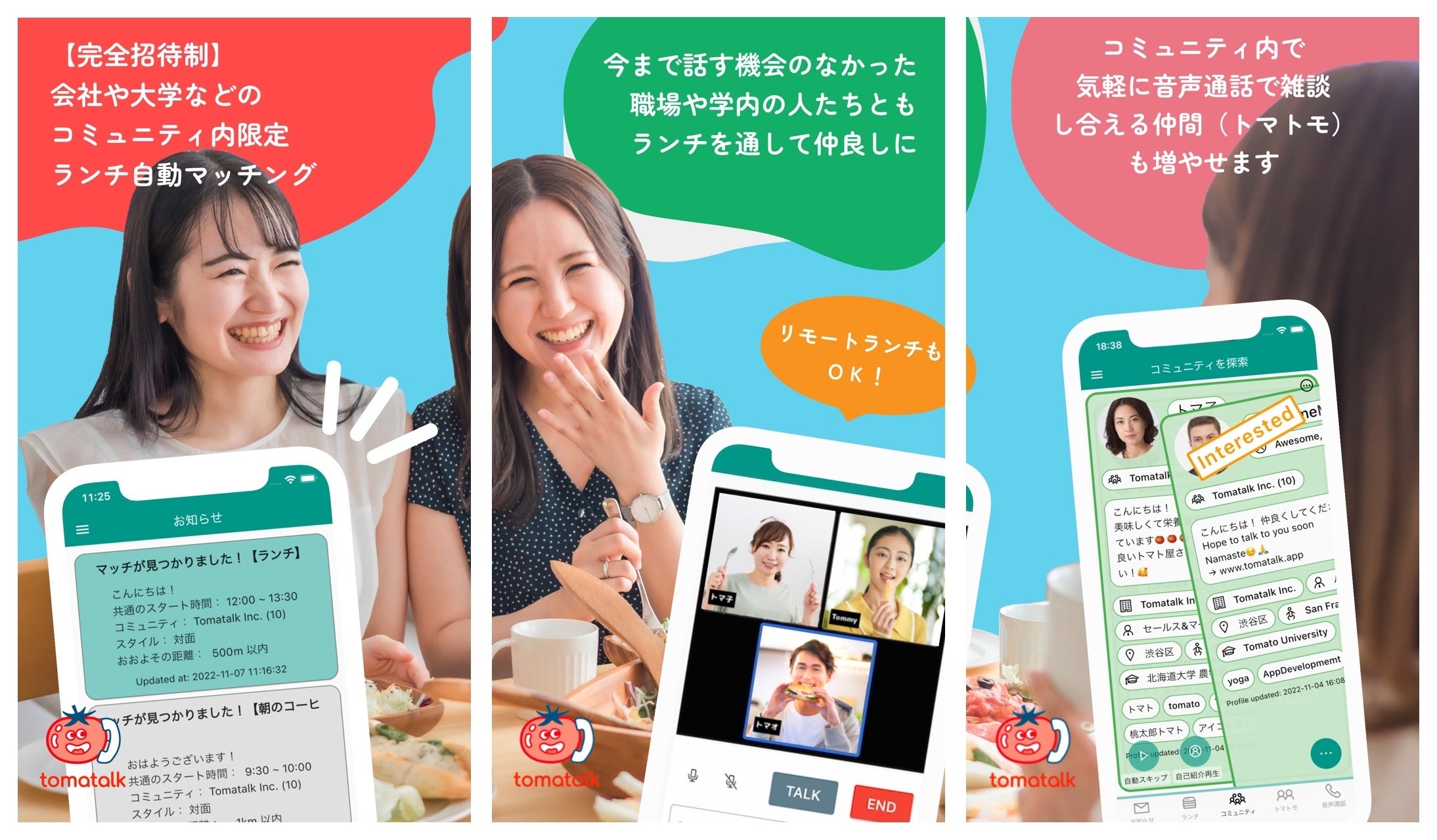 Tomatalkは、当社代表が米国カリフォルニア州ベイエリアの大学に留学していた時に、大学のカフェテリアや職場のシリコンバレーのスタートアップでランチを通じて交流の輪が広がっていった実体験をベースに開発しました。ランチを通じて多様な人々とのコミュニケーションを日常的に楽しむことができる社会の実現のために、今後もTomatalkをさらに進化させていきたいと考えています。