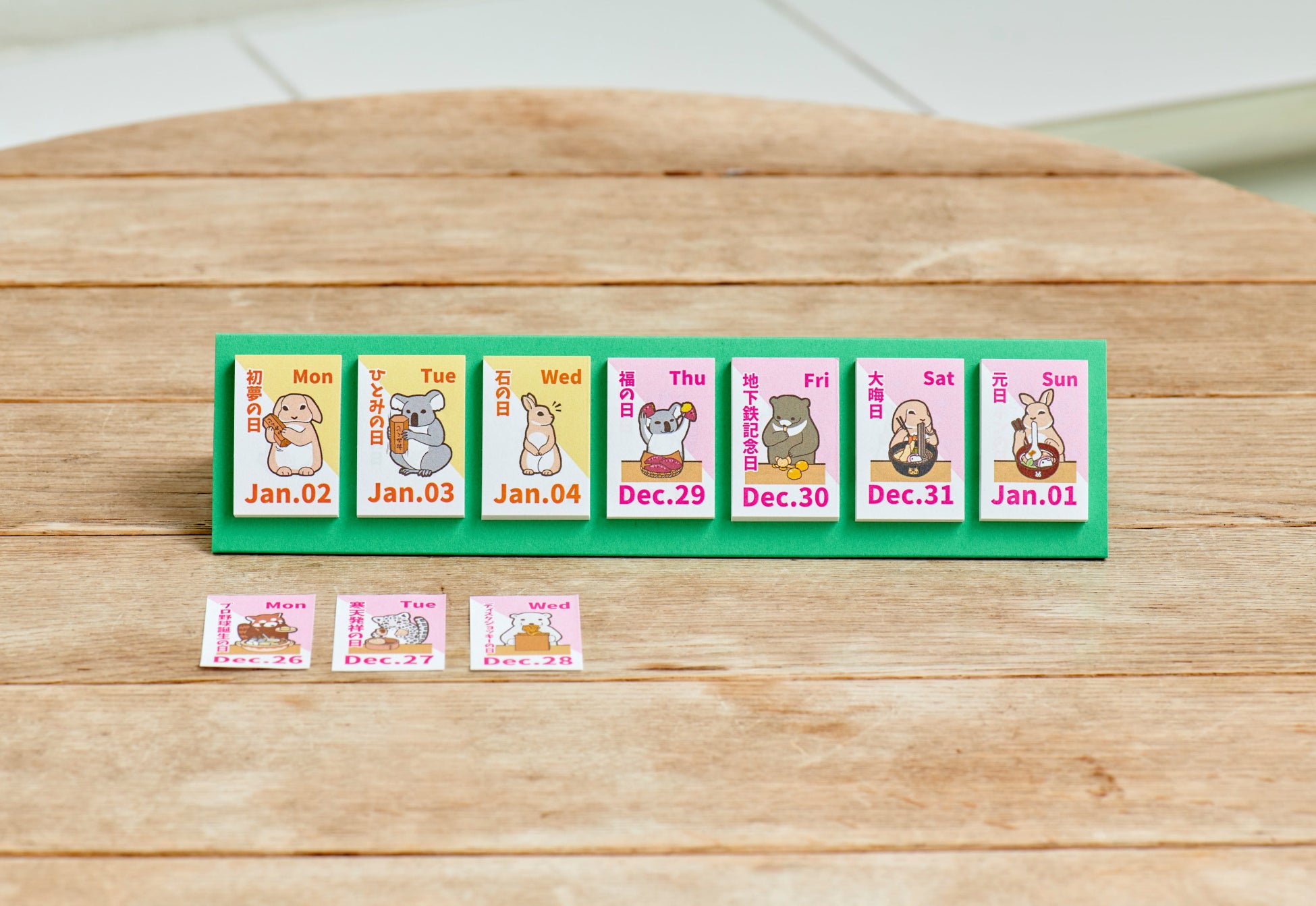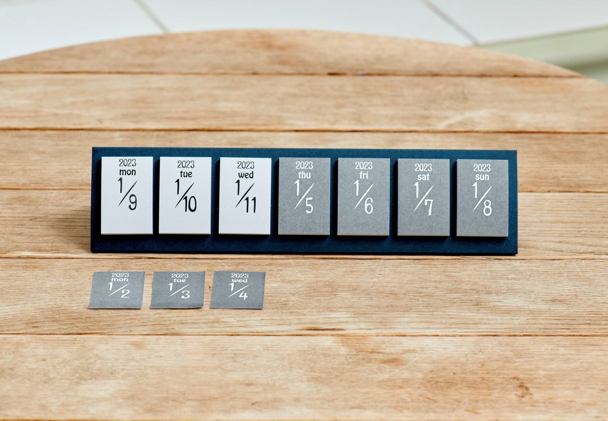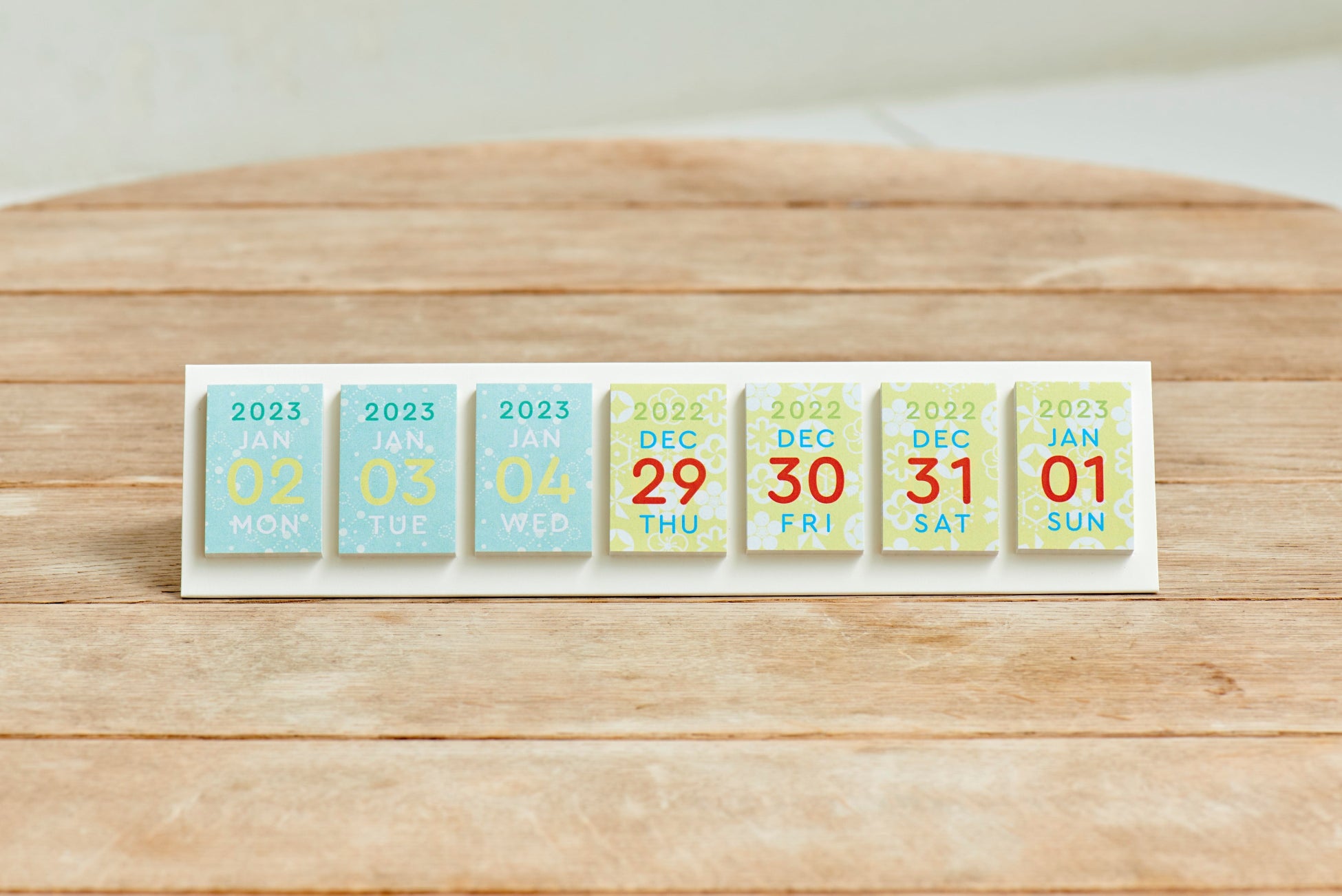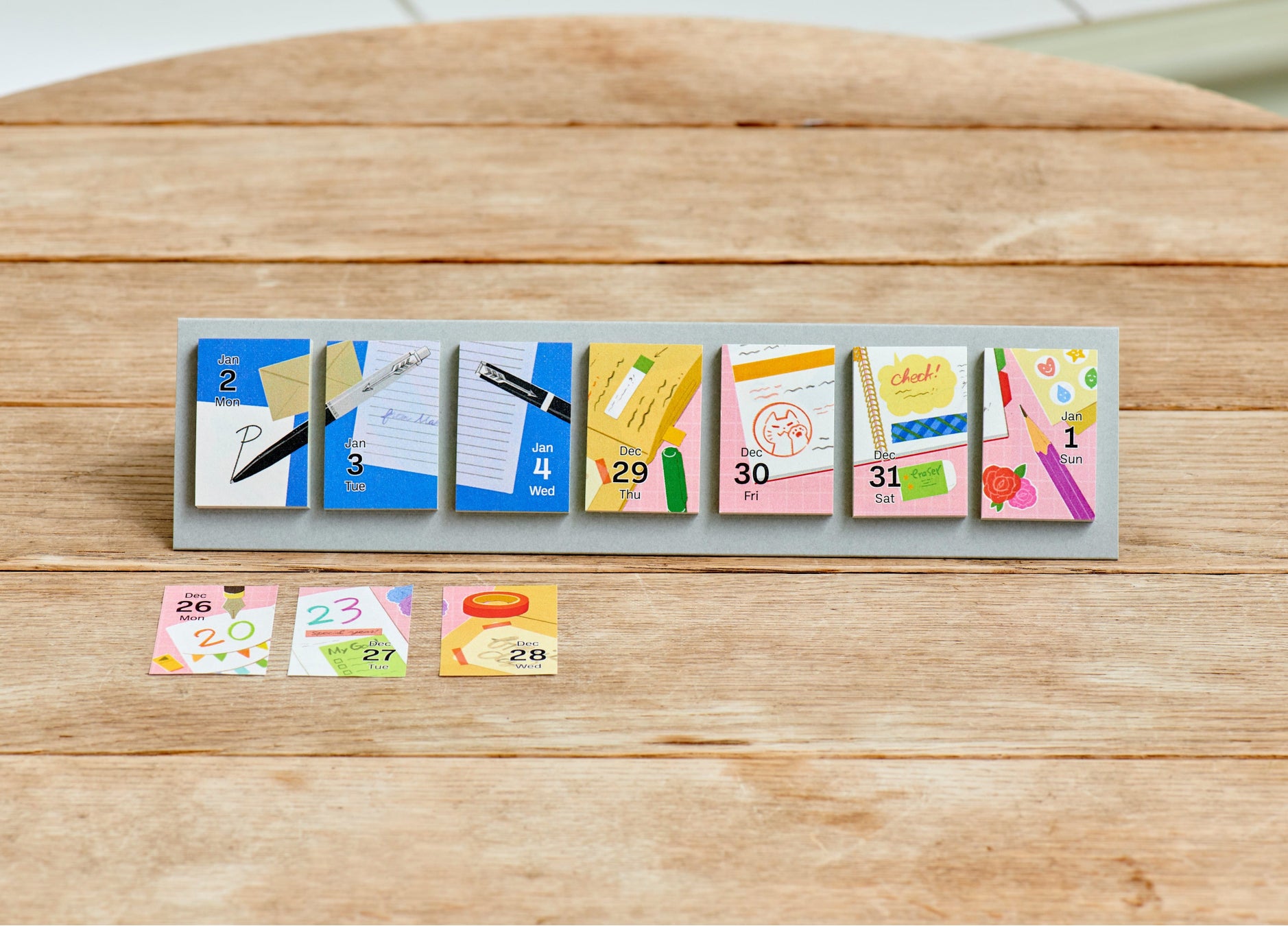 2018年に日本文具大賞 機能部門の優秀賞を受賞した、新しいタイプの卓上日めくりカレンダー。常に1週間分の日付が表示されており、1枚1枚に付せん加工が施されています。めくって処分するのではなく、付せんとして再利用できるカレンダーです。ノートや手帳に貼って日付シートにしたり、食品の開封記録にしたり、本の栞にしたりと様々な使い方ができます。