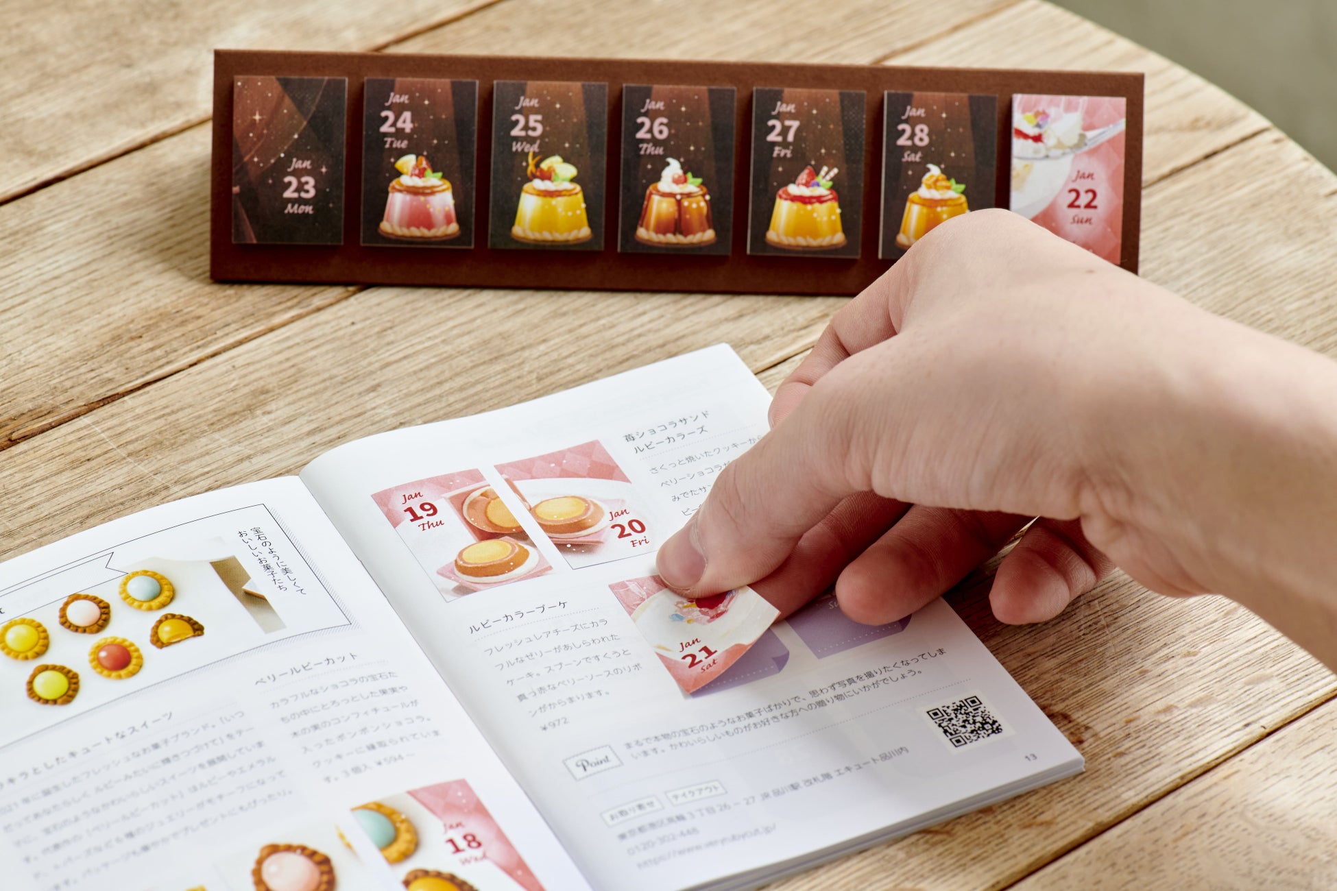 付属の特製ブックレットには店舗やスイーツの情報がたっぷり。めくったhimekuri付せんを貼ってスイーツガイドを完成させてください。掲載されているスイーツが気になったら、QRコードからぜひお取り寄せしてみてください。