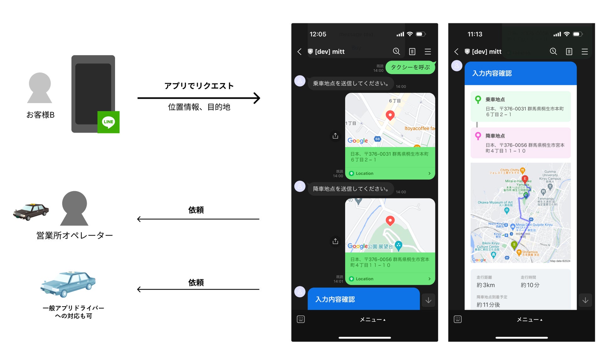 利用者は従来通り電話での配車依頼に加え、利用者自身がLINEで直接タクシーの予約や配車依頼をすることも可能になります。さらに、位置情報を利用し、目的地までの運賃を自動計算することで運賃の透明化も図れるほか、スマートフォン上での決済も可能となるなど、顧客満足度の高い拡張性のあるシステムが魅力です。