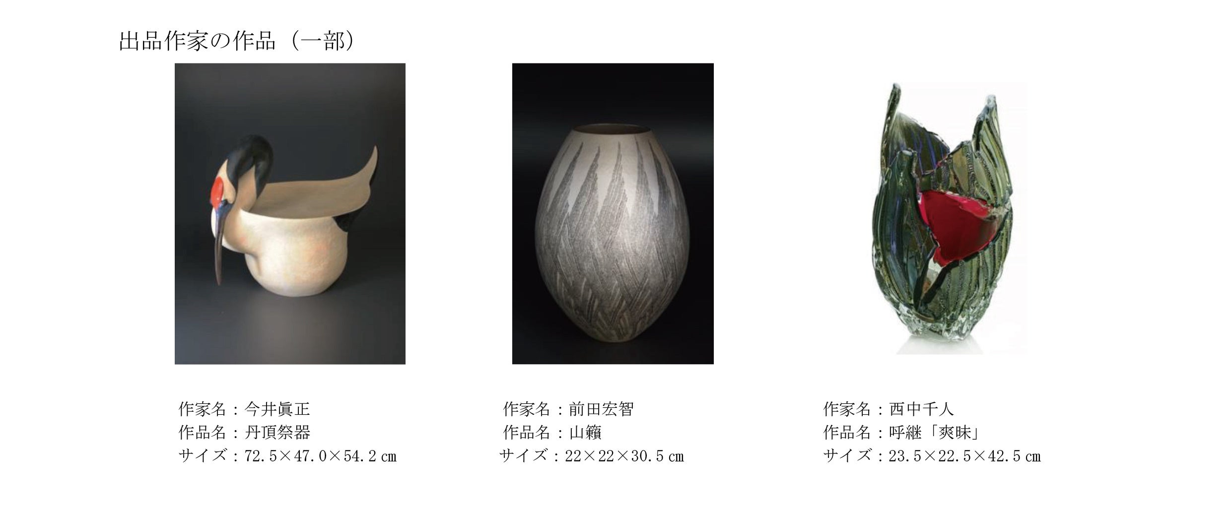 今回の展覧会では、京都府や各作家の皆様のご協力により、約100人の工芸美術作家と50人の現代アーティストの作品を展示・販売できることになりました。また、工芸美術作家と現代アーティストによるコラボレーション作品の展示・販売も実現しております。