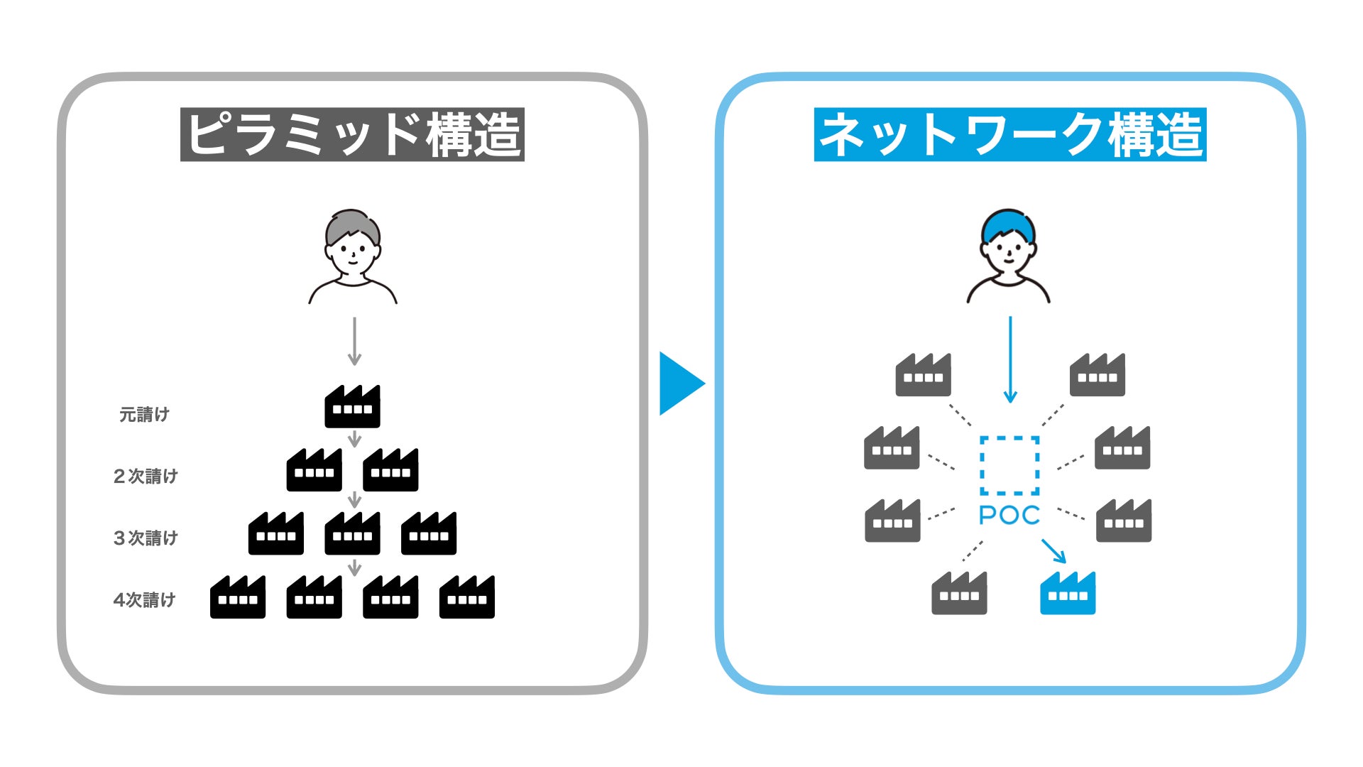 代理店、専門商社、印刷会社、卸などが中間に入る業界構造。加えて、工場を持つ1次製造元に連絡しても、自社設備での対応が難しい加工は、協力会社に回して製造する商慣習となっています。これによって多重マージンや、納期の長期化などが生じています。