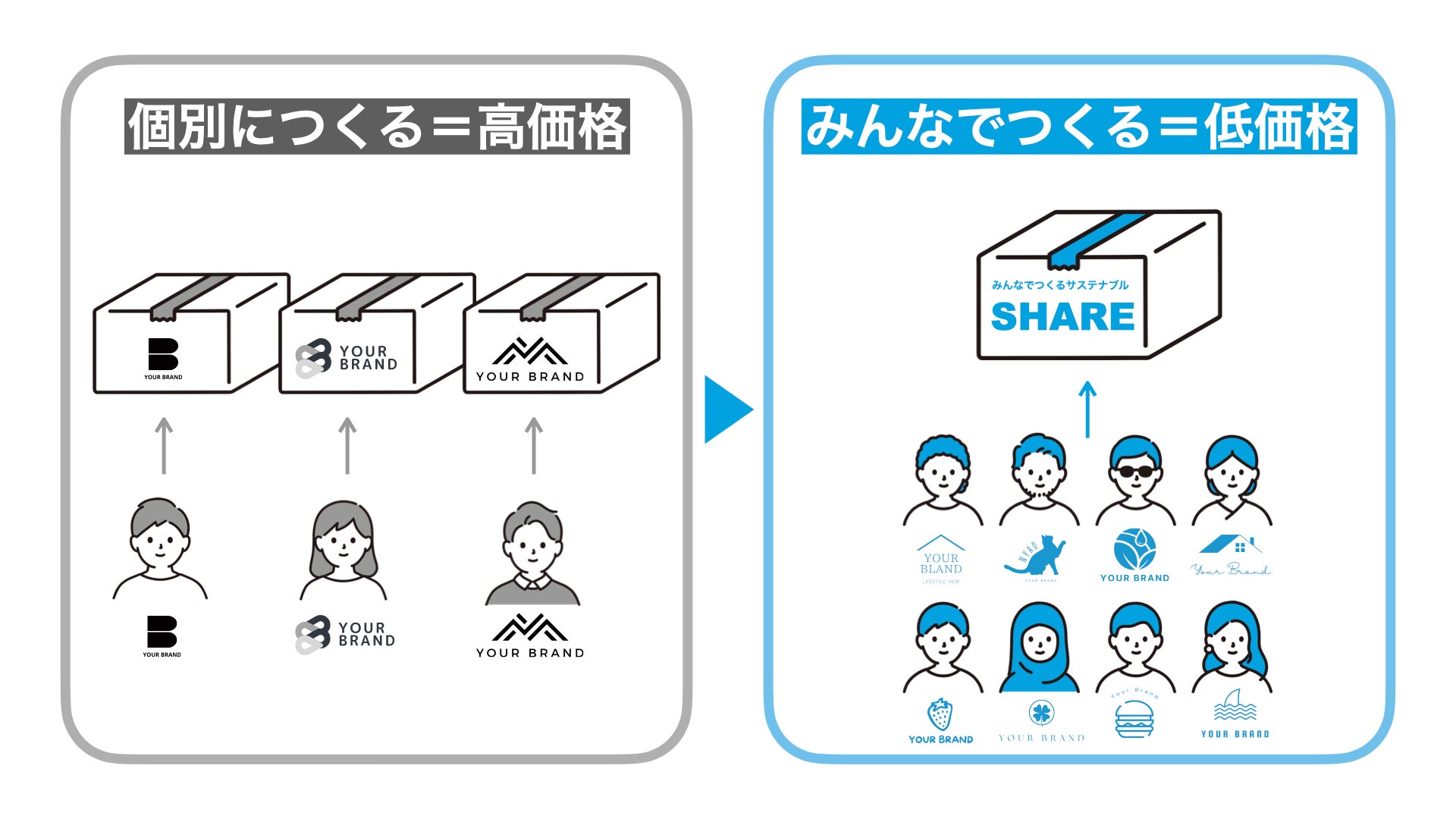 POCには「サステナブル」という志を同じくするブランドが集まり、共同で1つのパッケージをつくる「シェア制作」という機能があります。複数のブランドが集まり発注ロットを上げることで、高価なサステナブル材料をみんなで使えるようにしていきます。また、コミュニティ参加者間での相互送客やクリエイティブシェア(※)など、様々な付加価値づくりにも取り組んでいく予定です。
