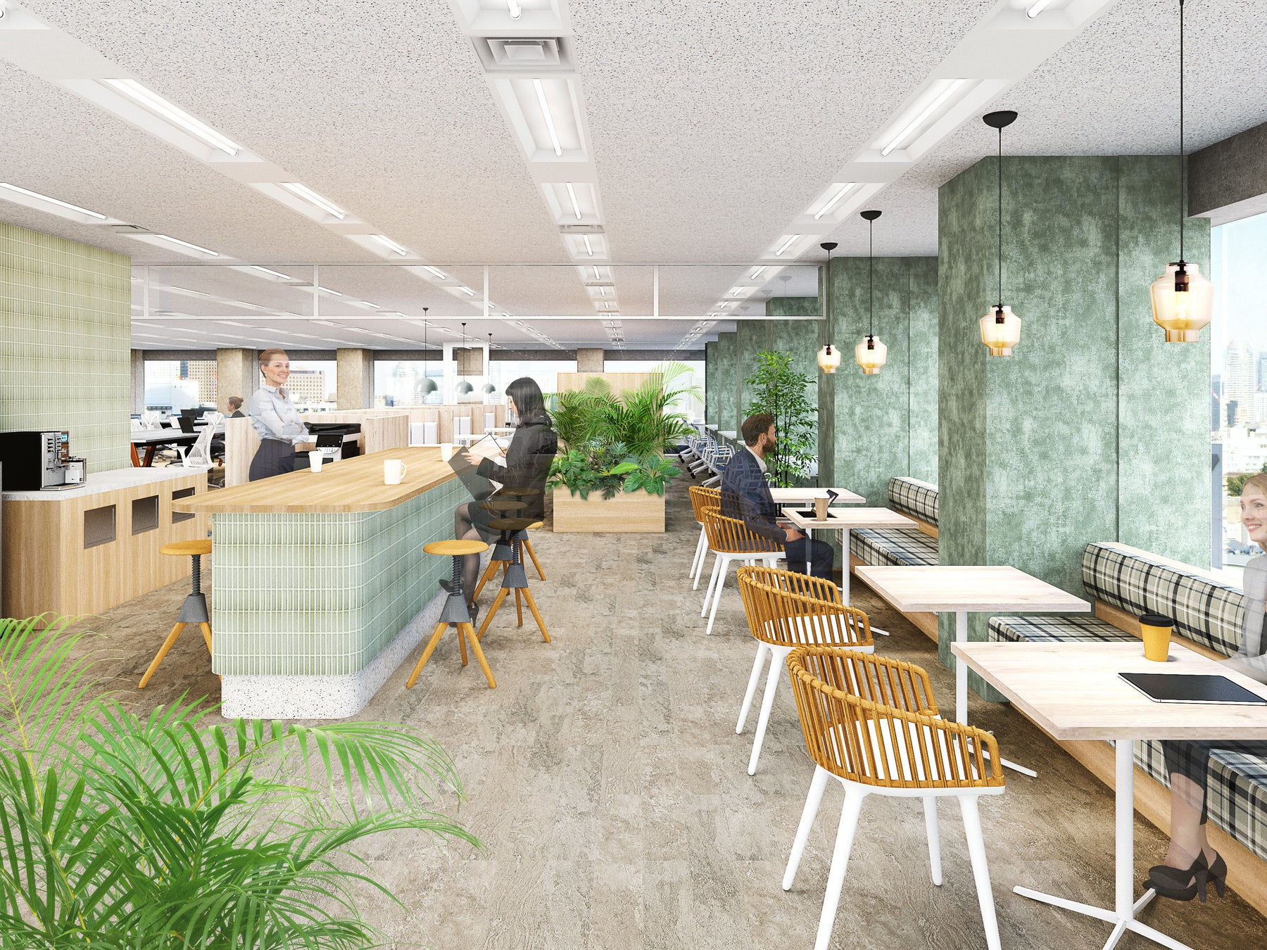 最上階には従業者が気兼ねなく集まれるギャザリングスペースを用意し、各事業会社の一体感とグループの連動性の両軸を実現します。会社の枠を超えた従業者間の交流だけではなく、普段本社では勤務していない全国の店舗やラボのメンバーが研修や会議で集まれる場、お取引先様やパートナー様とも交流できる場、各種イベントを実施できる環境を用意しました。