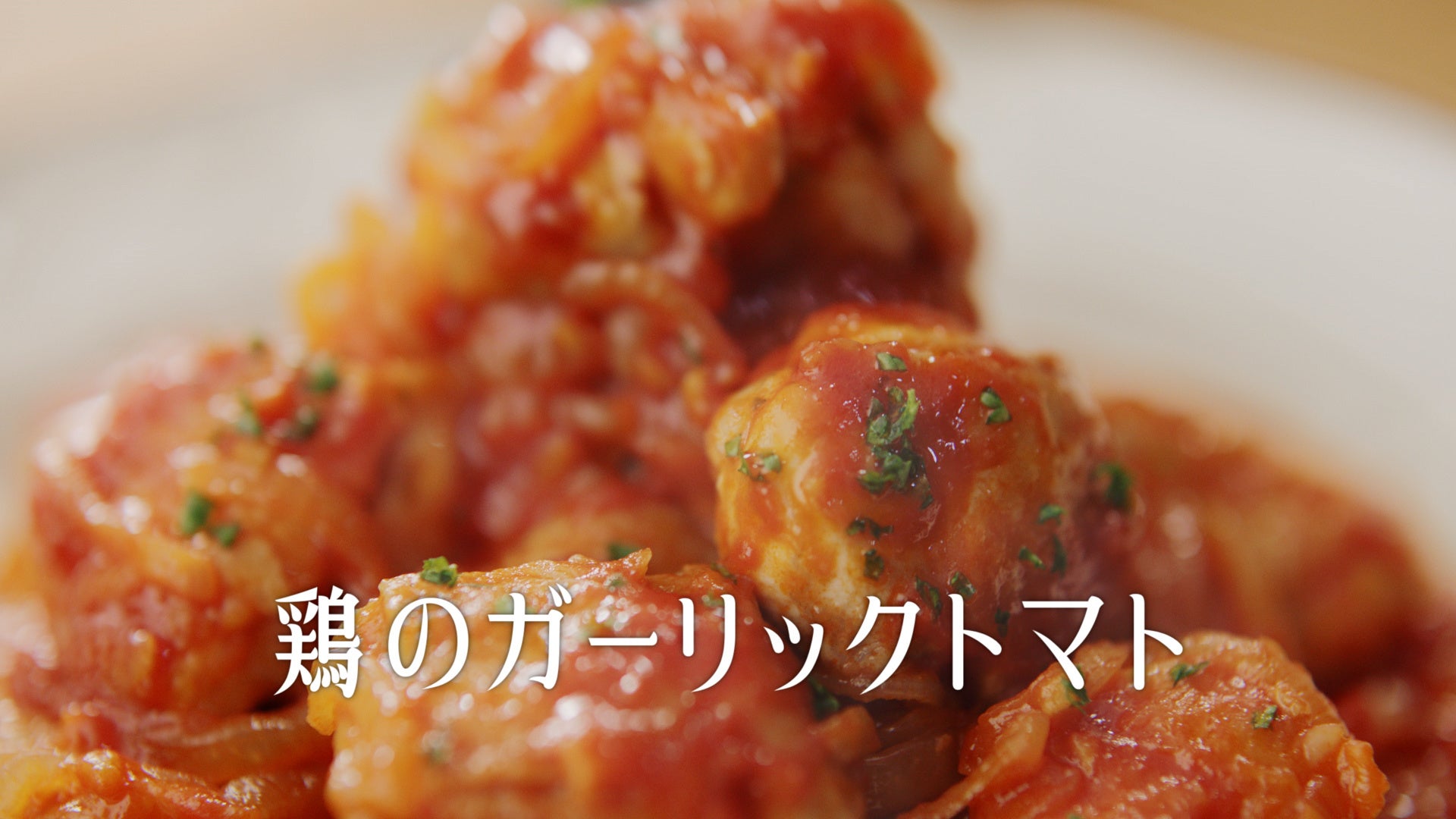 トマトのうま味とコクが特長の新品種<鶏のガーリックトマト用>を使って調理した洋食メニューを、おいしそうに頬張る新垣さんの表情にご注目ください。