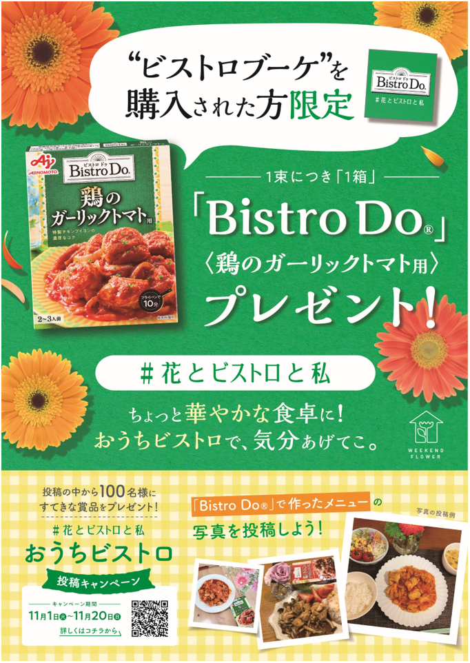 ●内容 :対象の花店で、緑色の「Bistro Do®」のタグの付いた“ビストロブーケ”(ダイニングブーケ)(税込み価格約1,000円)を購入すると、1束につき「Bistro Do®」<鶏のガーリックトマト用>1個をプレゼント