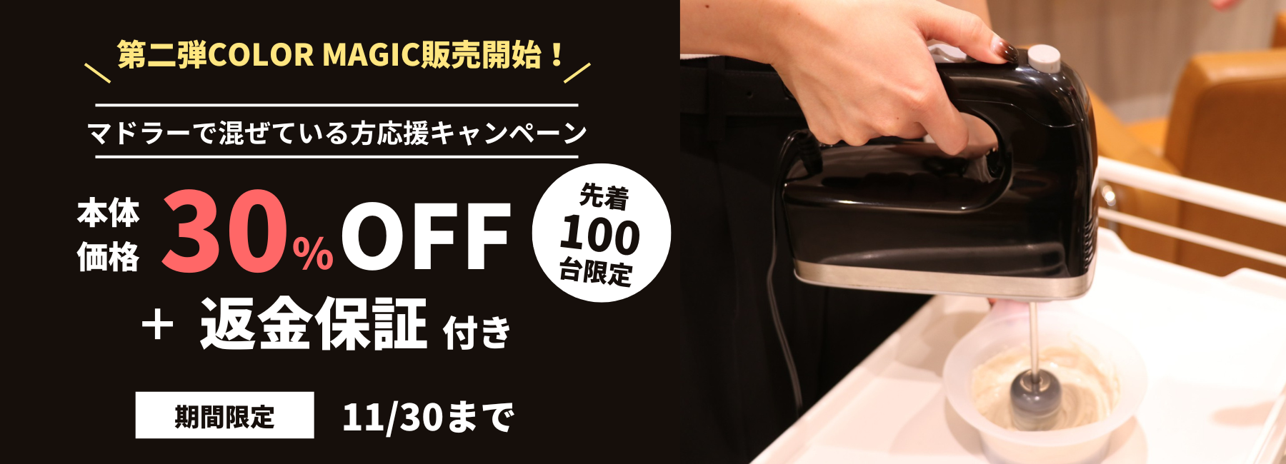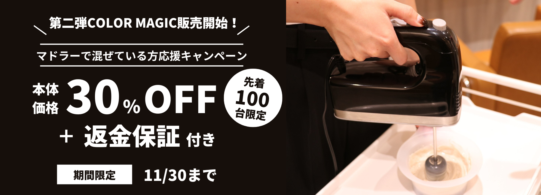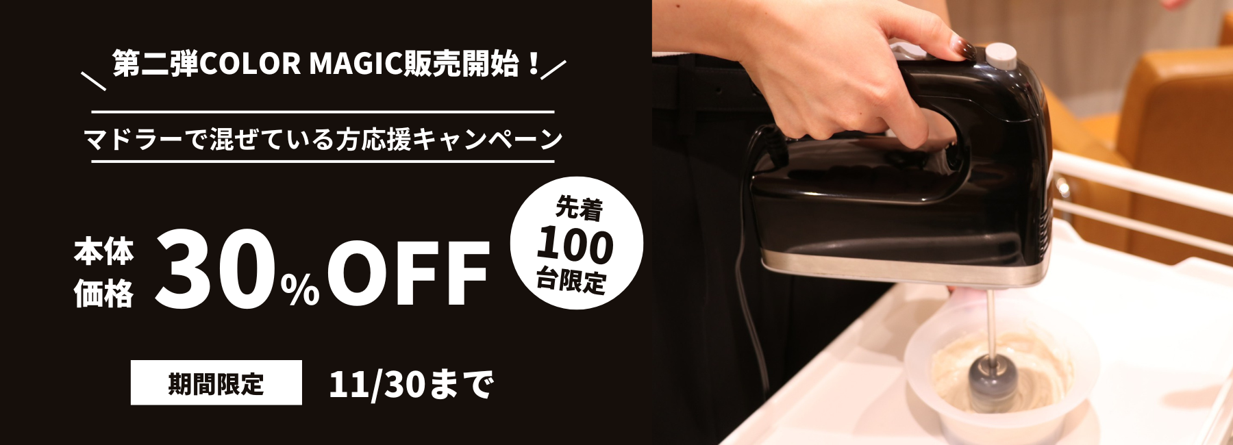 株式会社フォルム(本社:東京都目黒区、代表:永森 博明)が開発・販売するカラー剤専用ハンドミキサー「COLOR MAGIC」は、2022年11月30日までの期間で、100台限定/本体価格30%OFFで購入ができる「マドラーで混ぜている方応援キャンペーン」を実施しております。