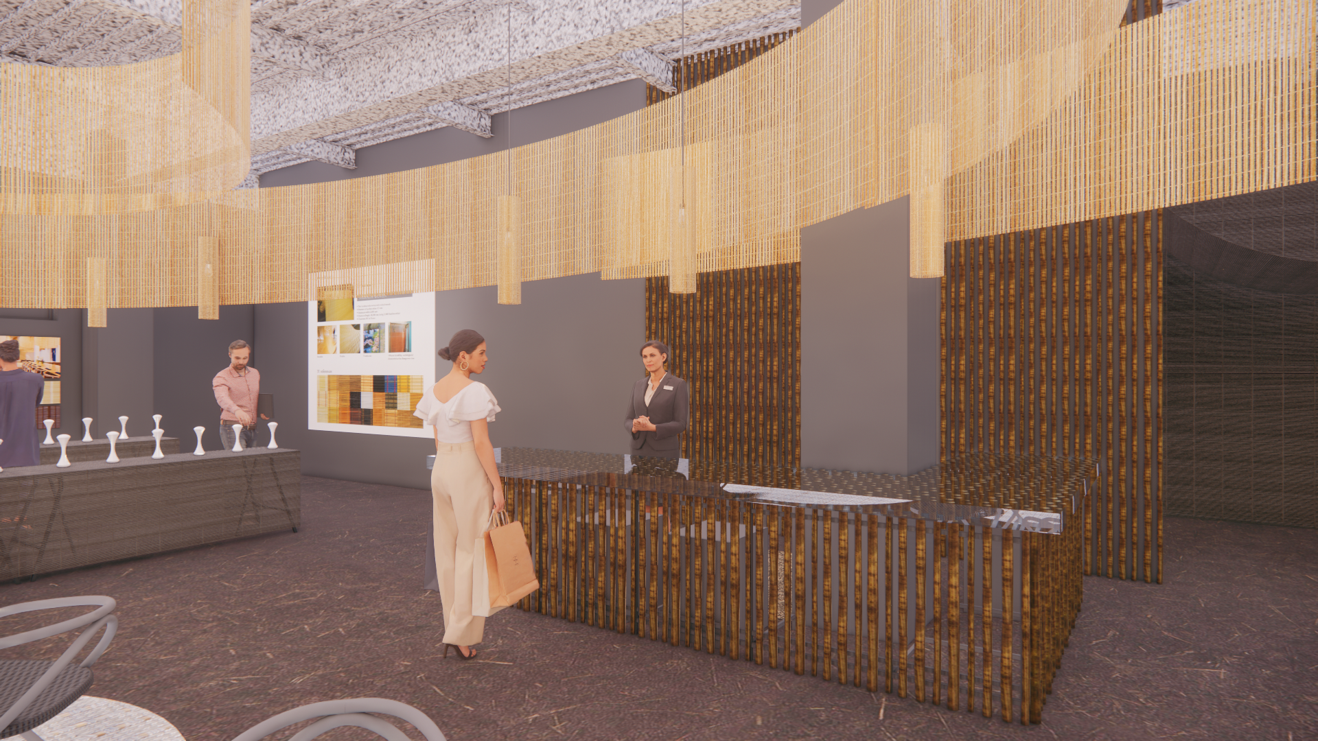 SHIKADA SHITSURAIショールームは、6つのゾーンで構成されており、持続可能な素材を使った次世代のホテル空間がコンセプトです。エントランス、ラウンジ、客室、ショップの各々のゾーンは、ホテルデザイン。すだれ生地サンプルを手に取ってみることができる製品ギャラリーゾーンとともに、当ショールームの特長である実験ルームゾーンでは、すだれ生地の伸縮特性や、透過性などを検証できるラボラトリーを併設しております。2020年に、JAPANブランド補助事業で海外展示会へ初出展。コロナ禍においても海外のデザイナーへ、竹素材の特性を伝えやすくするための取り組みを行って参りました。2023年2月頃にはラボで検証した画像や動画を多用した英語WEBサイトもリニューアル予定です。