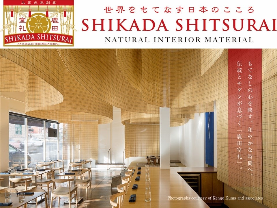 鹿田産業は福岡県にある大正元年創業の竹すだれのメーカー。創業110周年記念としてSHIKADA SHITSURAIショールームを改装オープン。地域工芸品を使った施工例や隈研吾氏デザインの籐家具を新発売