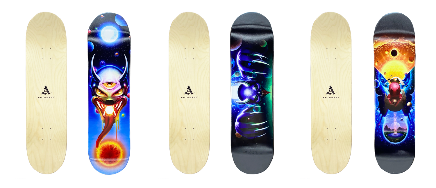 また、取り扱いブランド「ARTCHEY(アーケニー)」と「CVTLIST SB(カタリスト・エスビー)」の限定スケートボードデッキも登場。国内外から注目され活躍中のデジタルアーティスト「Sora/Aota氏」のアートを落とし込んだARTCHENYのデッキや、 CVTLIST SBとAPPLICATION、「北陸製菓:ビーバー」とのトリプルコラボレーションによるデッキとTシャツ(お菓子付き)は、APPLICATIONの為に特別に製作された、他では手に入らないスペシャルプロダクトとなっております。