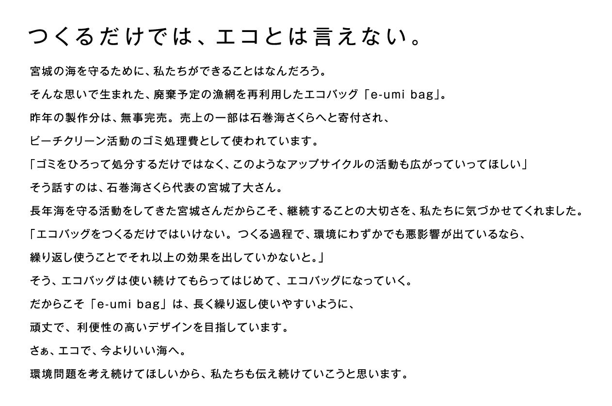 株式会社河北新報社(宮城県仙台市青葉区 代表取締役社長:一力雅彦)は、廃棄予定の漁網を再利用したエコバッグ「e-umi bag」の第二弾を2022年11月24日より販売いたします。