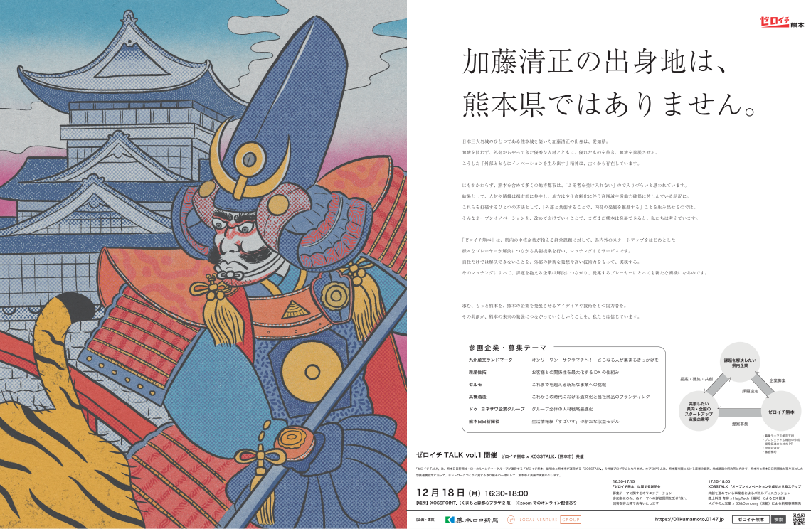 熊本日日新聞社・ローカルベンチャーグループが 運営する「ゼロイチ熊本」は、熊本市が運営する起業交流イベント「XOSSTALK.」と共催で、オープンイノベーション促進プログラム「ゼロイチTALK」を実施いたします。