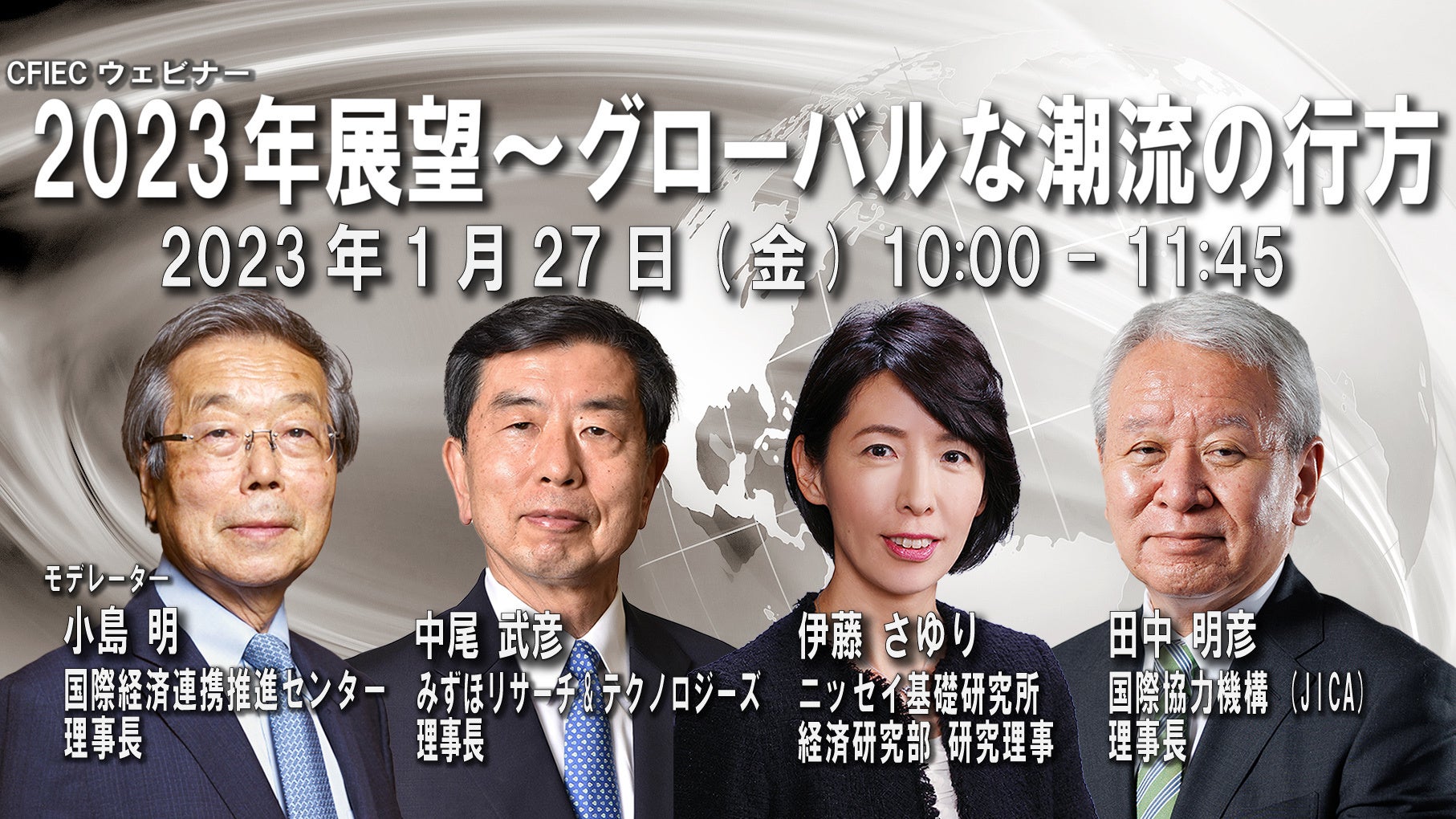 【1月27日開催】「2023年展望~グローバルな潮流の行方」CFIECウェビナーでは、世界情勢と日本の針路について、JICA理事長の田中明彦氏、みずほリサーチ&テクノロジーズ理事長の中尾武彦氏、ニッセイ基礎研究所研究理事の伊藤さゆり氏を迎え、CFIEC小島明理事長がモデレータ-で討論します。
