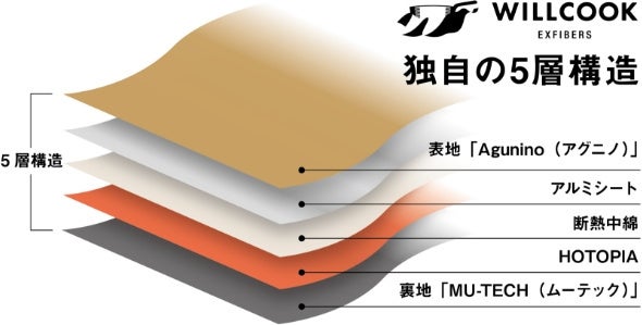 (1)株式会社三機コンシスが開発した、繊維自体が発熱する新感覚の布製ヒーティングシステム。導電繊維を独自の技術で編み込む特許技術ともう一つの特許である伸縮電線で、通常の布と同じ柔軟性・軽量性を持ちながら、素早く均一な温かさを実現する布製ヒーターです。WILLCOOK®はこの布ヒーターを使用しています。