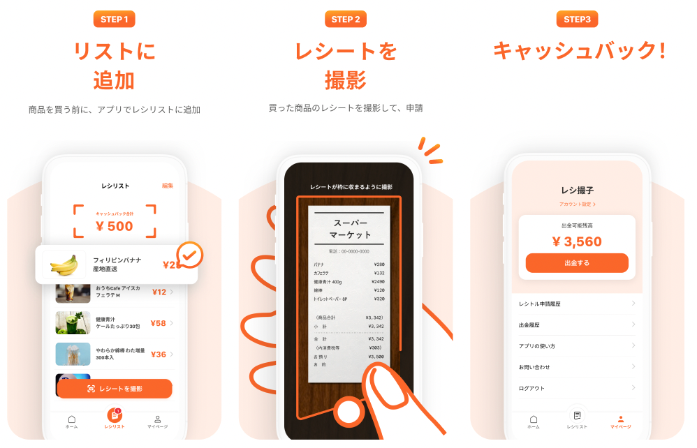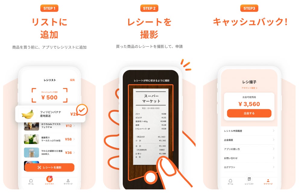 レシトルは、「ホーム」画面に掲載されている食料品・日用品・消費財の中から購入したい商品を選択して「レシリスト」に追加し、スーパー・コンビニ・ドラッグストアなどで購入した該当商品のレシートを撮影すると、キャッシュバックがもらえる"レシ活アプリ"です。スーパー・コンビニ・ドラッグストアで日々買い物をする主婦層を中心に、"レシ活"や"ポイ活"に関心のあるユーザーや、幅広い年代の消費者が使いやすいよう、シンプルでリーンなアプリ画面設計が特徴となっています。