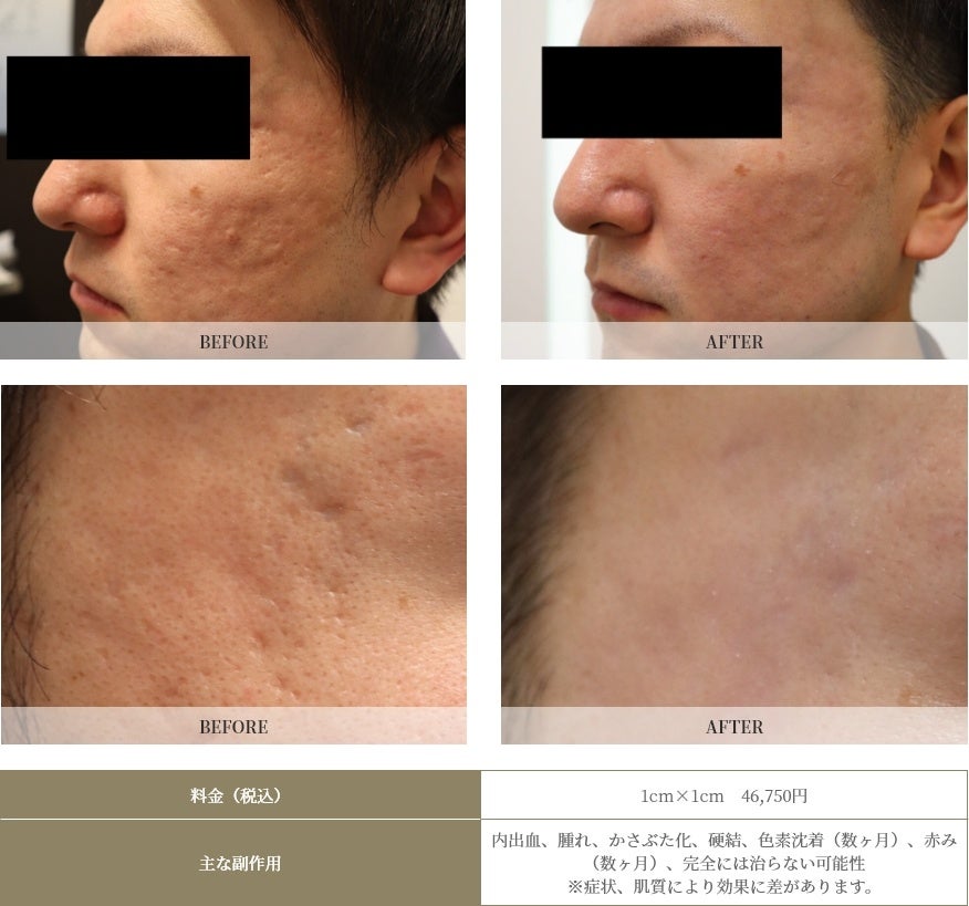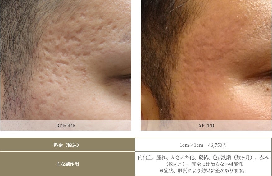 炭酸ガスレーザーでニキビ跡の辺縁を削り目立たなくさせると共に、サブシジョンによりニキビ跡の瘢痕組織を水平方向に切り離すことで、下方に引っ張られていたニキビ跡がふっくらするので、高い効果を期待できます。