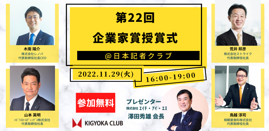 第22回企業家賞受賞者決定!授賞式を11/29に日本記者クラブにて開催!