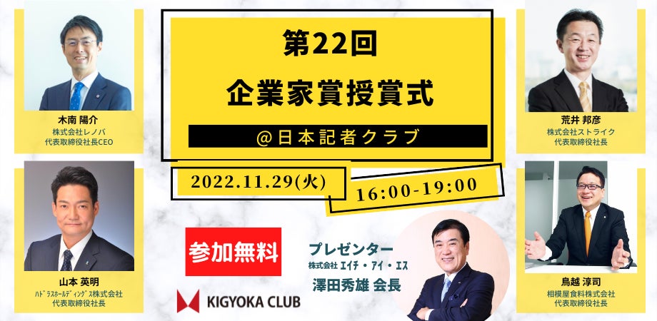 株式会社企業家倶楽部(本社:東京都中央区日本橋富沢町16−9 名門ビル、代表取締役社長:徳永健一)は、日本経済のこれからを創る企業家のための賞「第22回企業家賞授賞式」を2022年11月29日(火)に日本記者クラブで開催いたします。