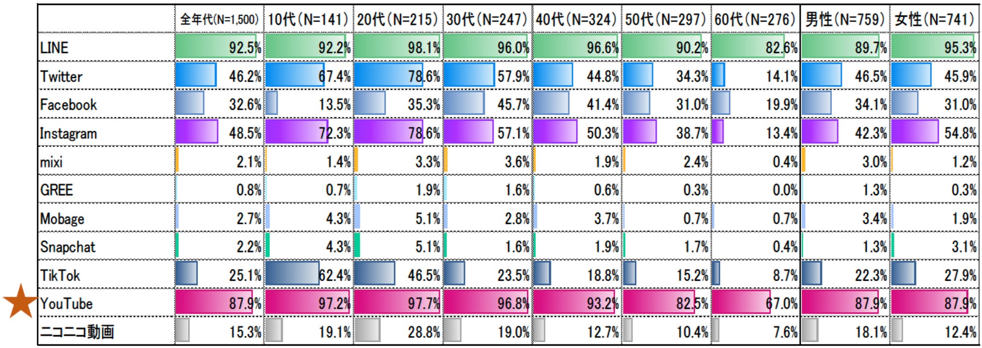YouTubeは10代〜40代までの全ての世代で利用率が90%を超過しており、Instagramなど他のSNSと比較して圧倒的であることからも、日本でも、YouTubeを通じたライブコマースへの期待が高まっています。