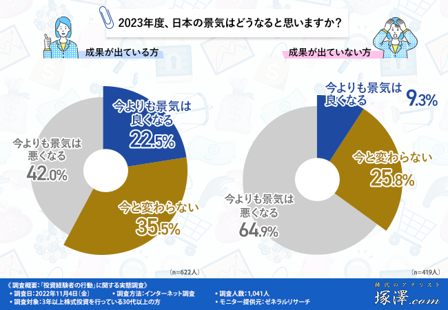 成果が出ている方に、「2023年度、日本の景気はどうなると思いますか?」と質問したところ、『今よりも景気は良くなる(22.5%)』『今と変わらない(35.5%)』『今よりも景気は悪くなる(42.0)%』という回答結果になりました。