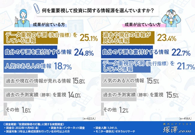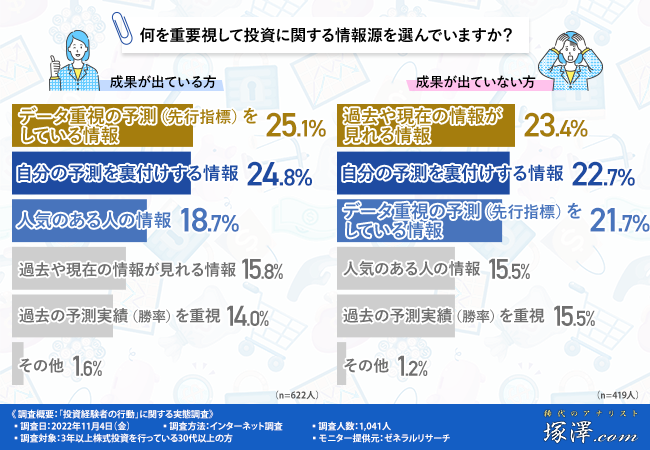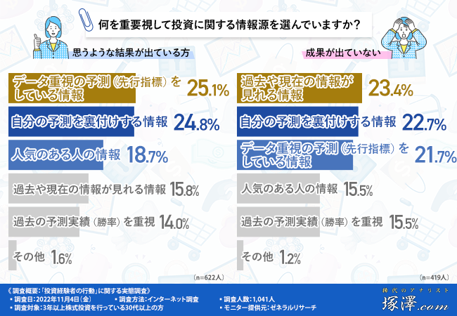 成果が出ている方に、「何を重要視して投資に関する情報源を選んでいますか?」と質問したところ、『データ重視の予測(先⾏指標)をしている情報(25.1%)』と回答した方が最も多く、次いで『⾃分の予測を裏付けする情報(24.8%)』『⼈気のある⼈の情報(18.7%)』と続きました。