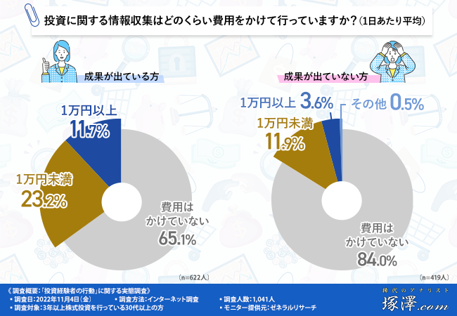 成果が出ている方に、「投資に関する情報収集にはどのくらい費用をかけていますか?(1か月あたり平均)」と質問したところ、『費用はかけていない(65.1%)』『1万円未満(23.2%)』『1万円以上(11.7%)』という回答結果になりました。