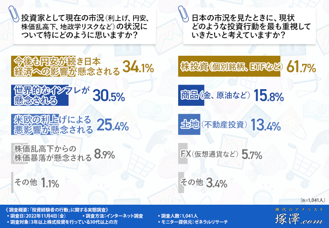 そこで、「投資家として現在の市況(利上げ、円安、株価乱高下、地政学リスクなど)の状況について特にどのように思いますか?」と質問したところ、『今後も円安が続き⽇本経済への影響が懸念される(34.1%)』と回答した方が最も多く、次いで『世界的なインフレが懸念される(30.5%)』『⽶欧の利上げによる悪影響が懸念される(25.4%)』と続きました。