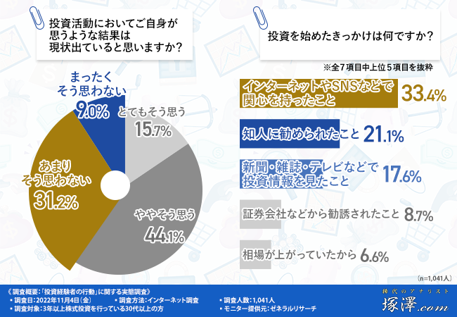 「投資活動においてご自身が思うような結果は現状出ていると思いますか?」と質問したところ、『とてもそう思う(15.7%)』『ややそう思う(44.1%)』『あまりそう思わない(31.2%)』『まったくそう思わない(9.0%)』という回答結果になりました。