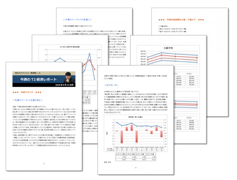 毎週月曜日、会員向け「今週のT2経済レポート」PDFファイル(A4用紙16ページほど)をメール配信。