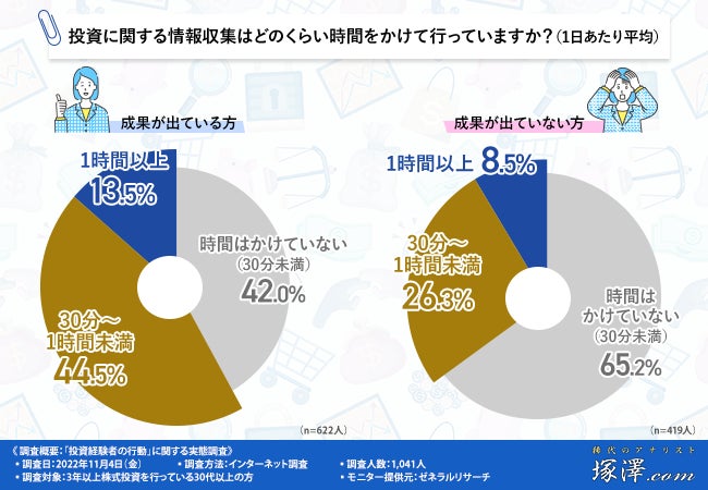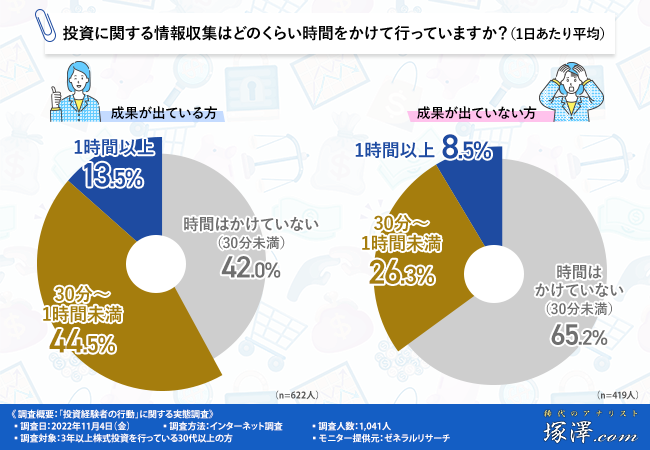 成果が出ている方に、「投資に関する情報収集はどのくらい時間をかけて行っていますか?(1日あたり平均)」と質問したところ、『30分~1時間未満(44.5%)』と回答した方が最も多く、次いで『時間はかけていない(30分未満)(42.0%)』『1時間以上(13.5%)』と続きました。