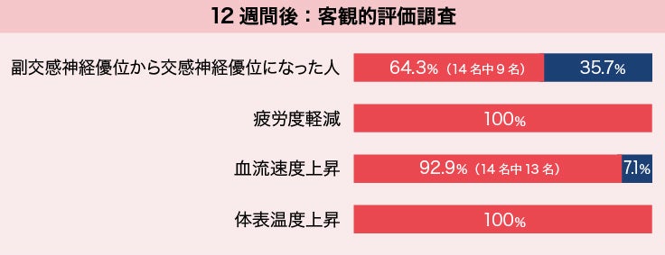 試験方法:12週間1日3粒を水またはぬるま湯で毎日朝食前に摂取し、アンケートによる主観評価と自律神経、疲労度、血流速度、体表温度の客観的評価を行った。試験期間中は規則正しい生活と日平均8,000歩の運動も併用