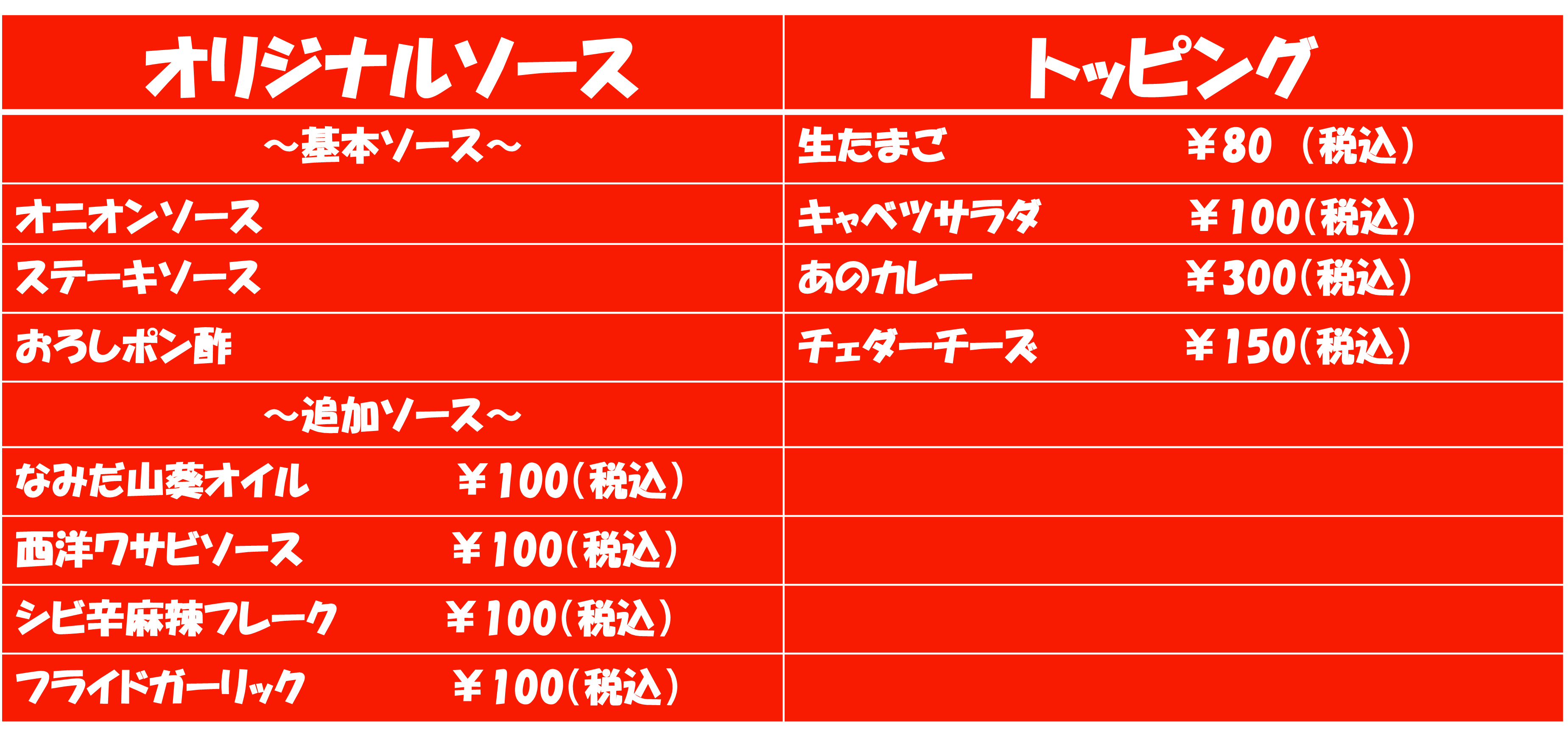 基本ソースは(オニオンソース、ステーキソース、特製おろしポン酢)からお選びできます。