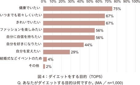 ・ダイエットの目的を聞いたところ、1位が「健康でいたい」(75%)、2位が「いつまでも若々しくいたい」(67%)、「きれいでいたい」(67%)、4位「ファッションを楽しみたい(56%)、「自分に自信を持ちたい」(56%)と続いた。(図4)