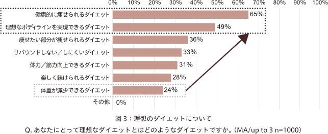 ・理想のダイエットについて問う設問で、1位は「健康的に痩せられるダイエット」 (65%)、次いで「理想的なボディラインを実現できるダイエット」(49%)が2位に続き、「体重が減少できるダイエット」(24%)と20ポイント以上の差をつけた。ダイエットに対し、体重を減らすだけでなく、健康的に理想のボディラインを実現することを望んでいることが明らかになった。(図3)