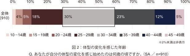 - 自身の体型の変化についての設問では、体型の変化を感じると回答したのは92%に達し、変化を感じ始めた年齢で最も多いのは「30~34歳」(30%)、平均年齢は「31.6歳」であった。